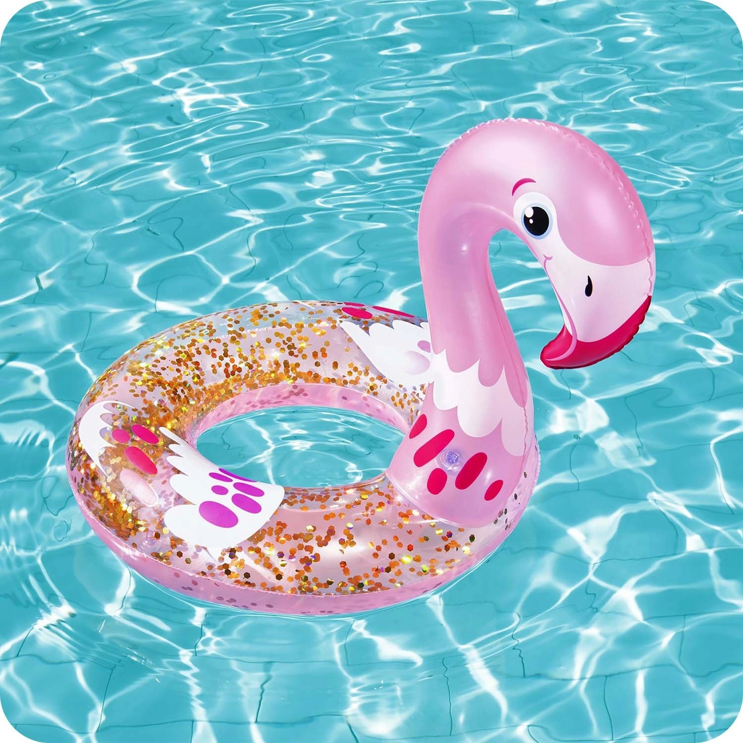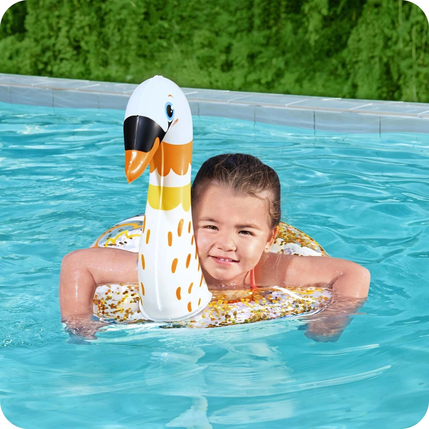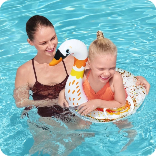 L’anello gonfiabile BESTWAY trasforma ogni momento in acqua in puro divertimento. La forma realistica di cigno o fenicottero cattura subito l’attenzione e invoglia i piccoli a muoversi in acqua. Le parti trasparenti con glitter dorati brillano splendidamente al sole e donano all’anello un aspetto unico.
