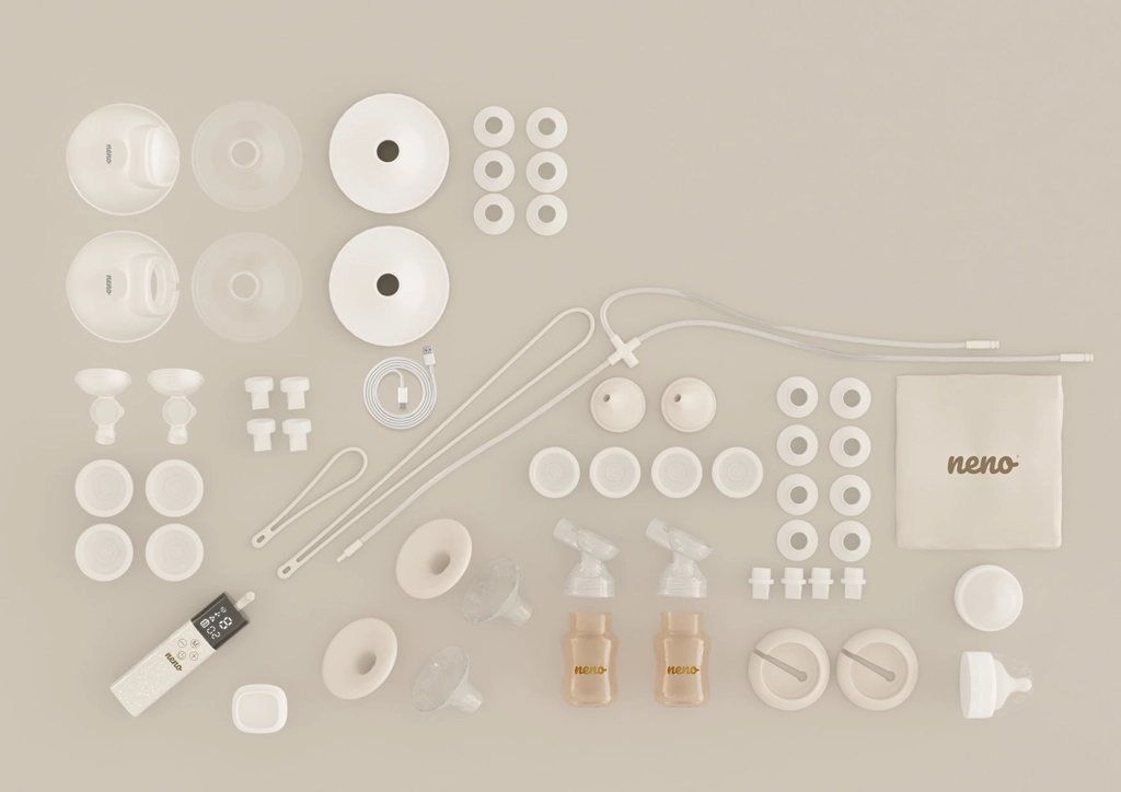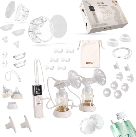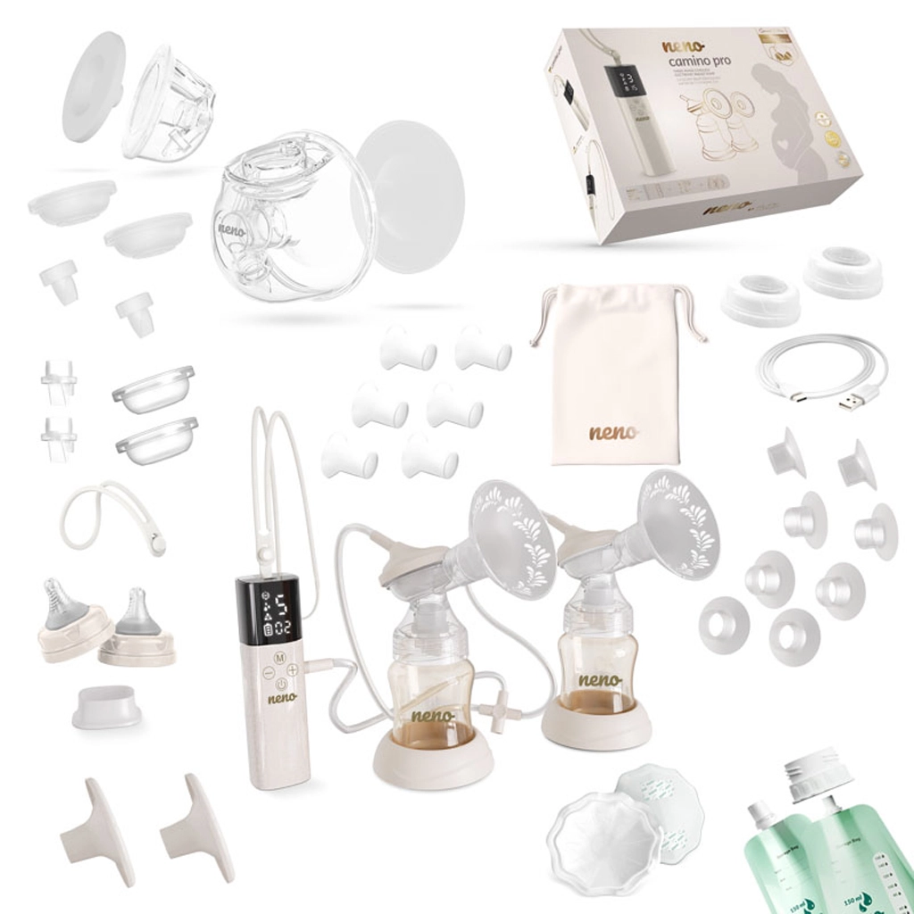 - Tiralatte Neno Camino Pro, supporto, cavo USB‑C, custodia in velluto, 2× sacchetto per latte, 2× coppette assorbilatte, 2× laccetti (lungo e corto); set per estrazione in bottiglia (2× bottiglia 150 ml, 2× copertura scudo, 2× scudo 24 mm, 2× supporto, tubicino in silicone, 4× membrana, 4× valvola, 2× connettore, 2× set di riduttori 15/17/19/22 mm, 2× tappo bottiglia con connettore); set per raccolta hands‑free (2× contenitore 240 ml, 2× connettori, 2× coperture membrane, 4× membrane, 2× scudi 24 mm, 4× valvole, 2× coperture scudi, 2× set di riduttori 17/19/21 mm)