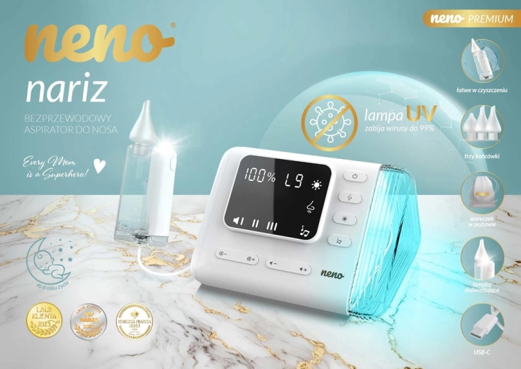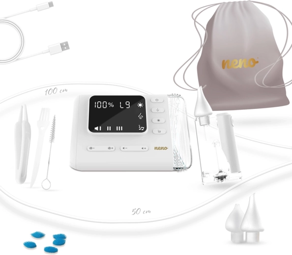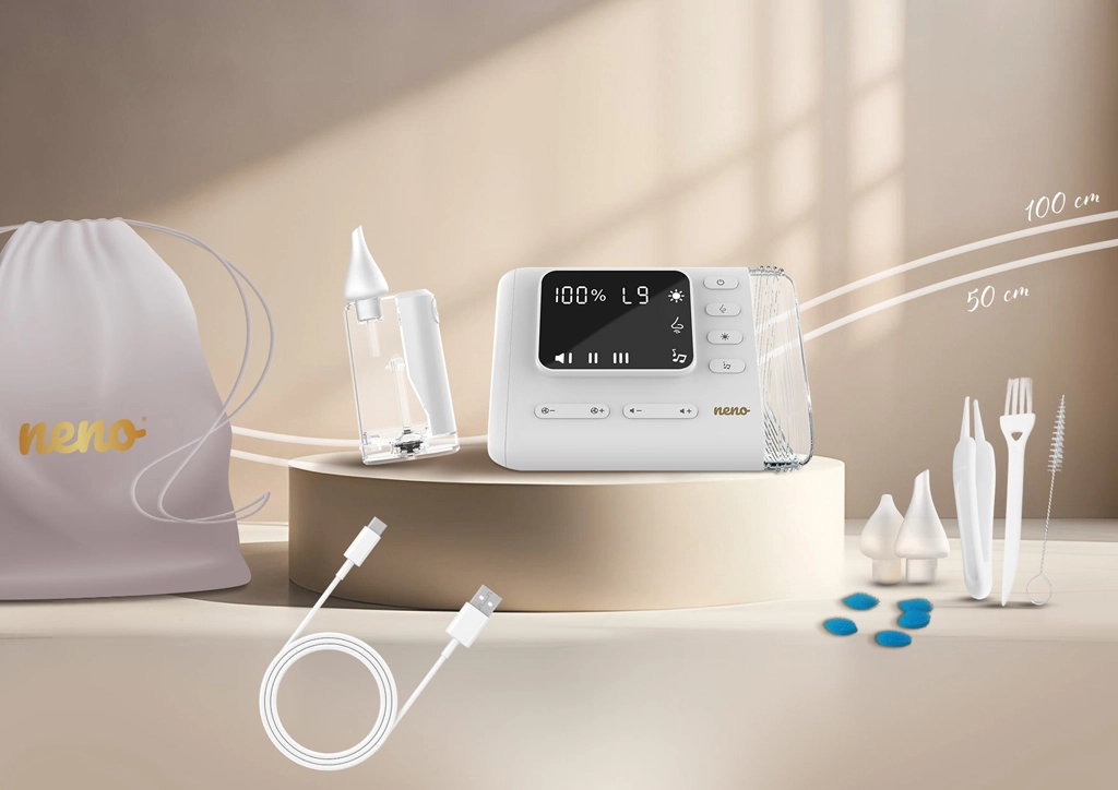 - Aspiratore elettronico Neno Nariz, 3 beccucci in silicone, contenitore del muco con illuminazione LED, 2 tubicini (50 cm e 100 cm), 5 filtri, spazzolino e spazzolino piatto, pinzetta, cavo di ricarica USB‑C, tasca portaoggetti, manuale