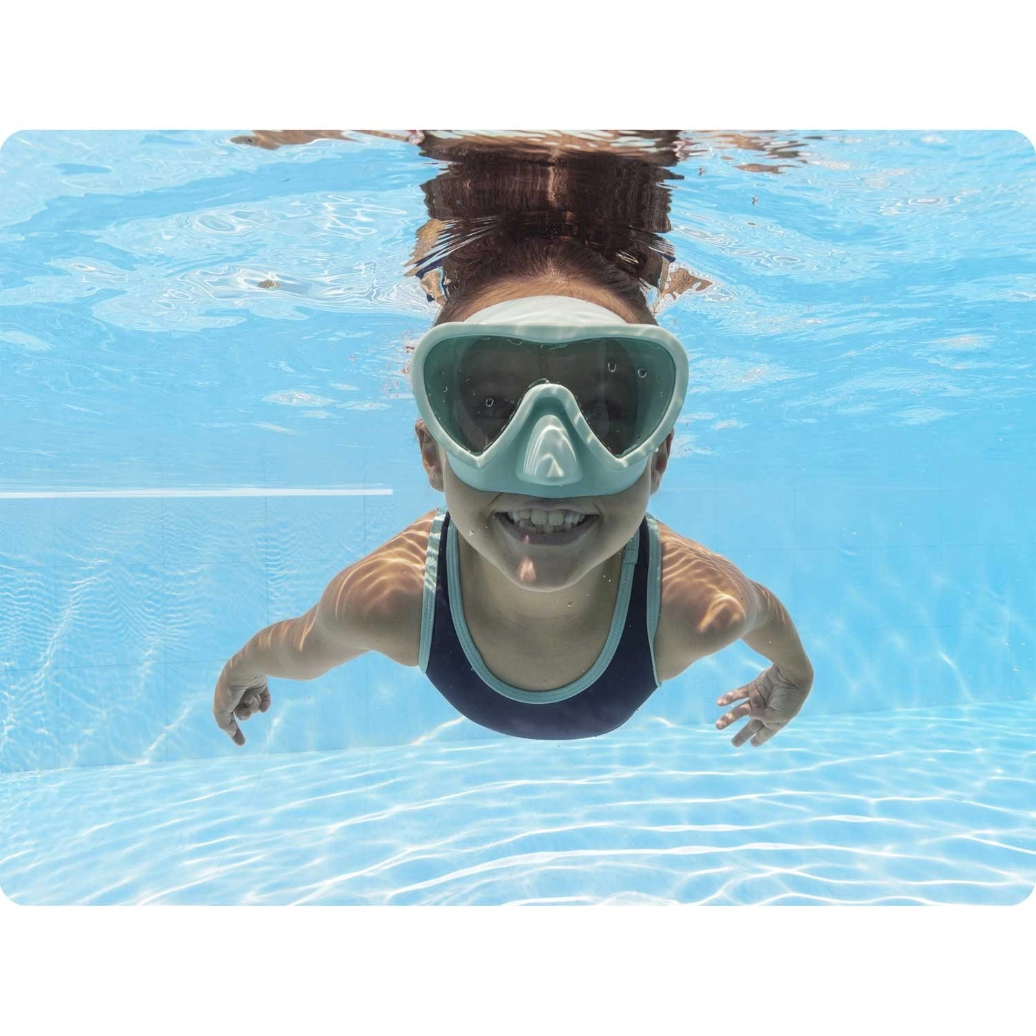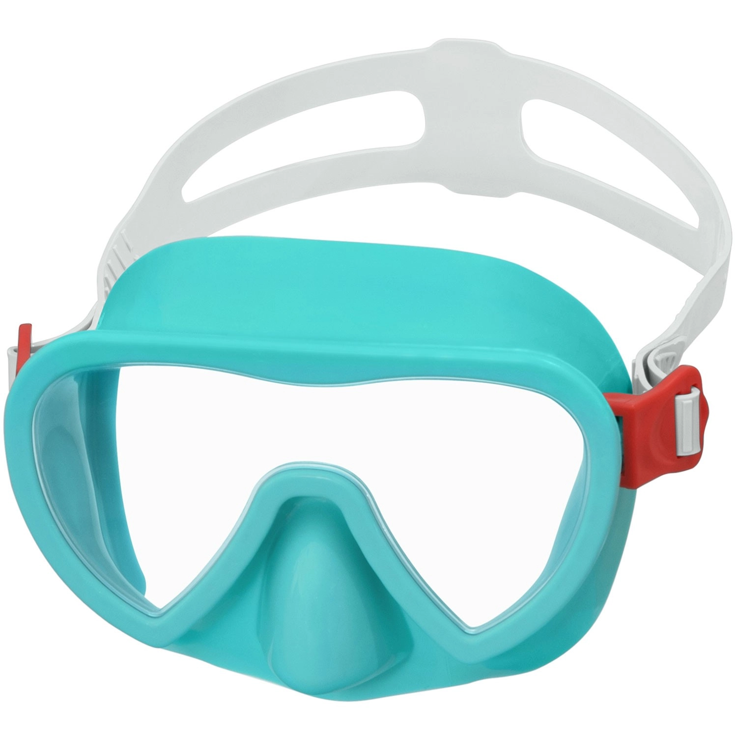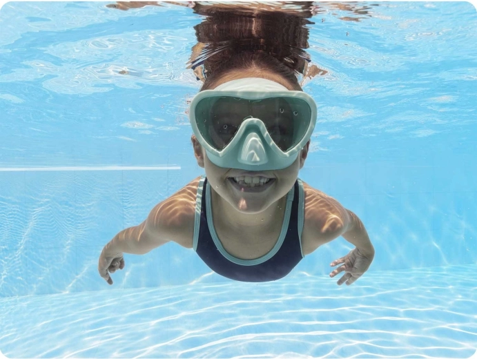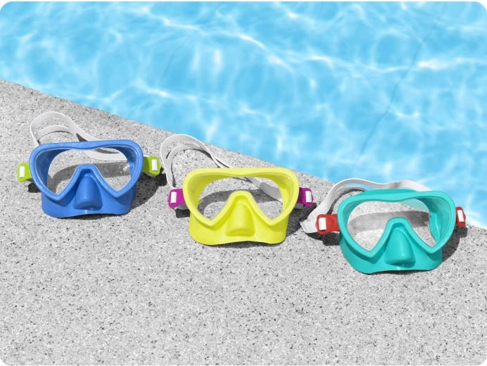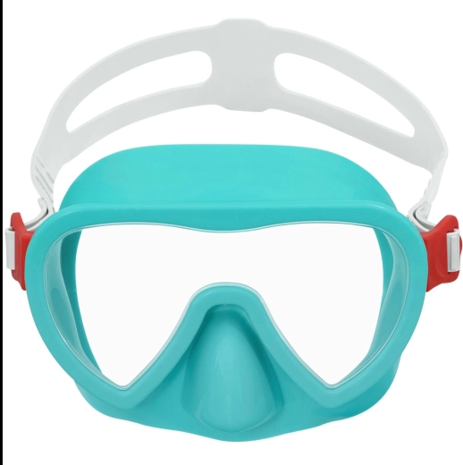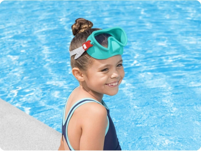 Scopri il mondo sottomarino con la comoda maschera per bambini BESTWAY in colore turchese. L’ampia lente in policarbonato con protezione UV garantisce una visione chiara e ampia, la morbida gonna si adatta perfettamente al viso e il cinturino in silicone regolabile mantiene la maschera saldamente in posizione. Senza lattice, adatta ai bambini dai 3 anni in su.