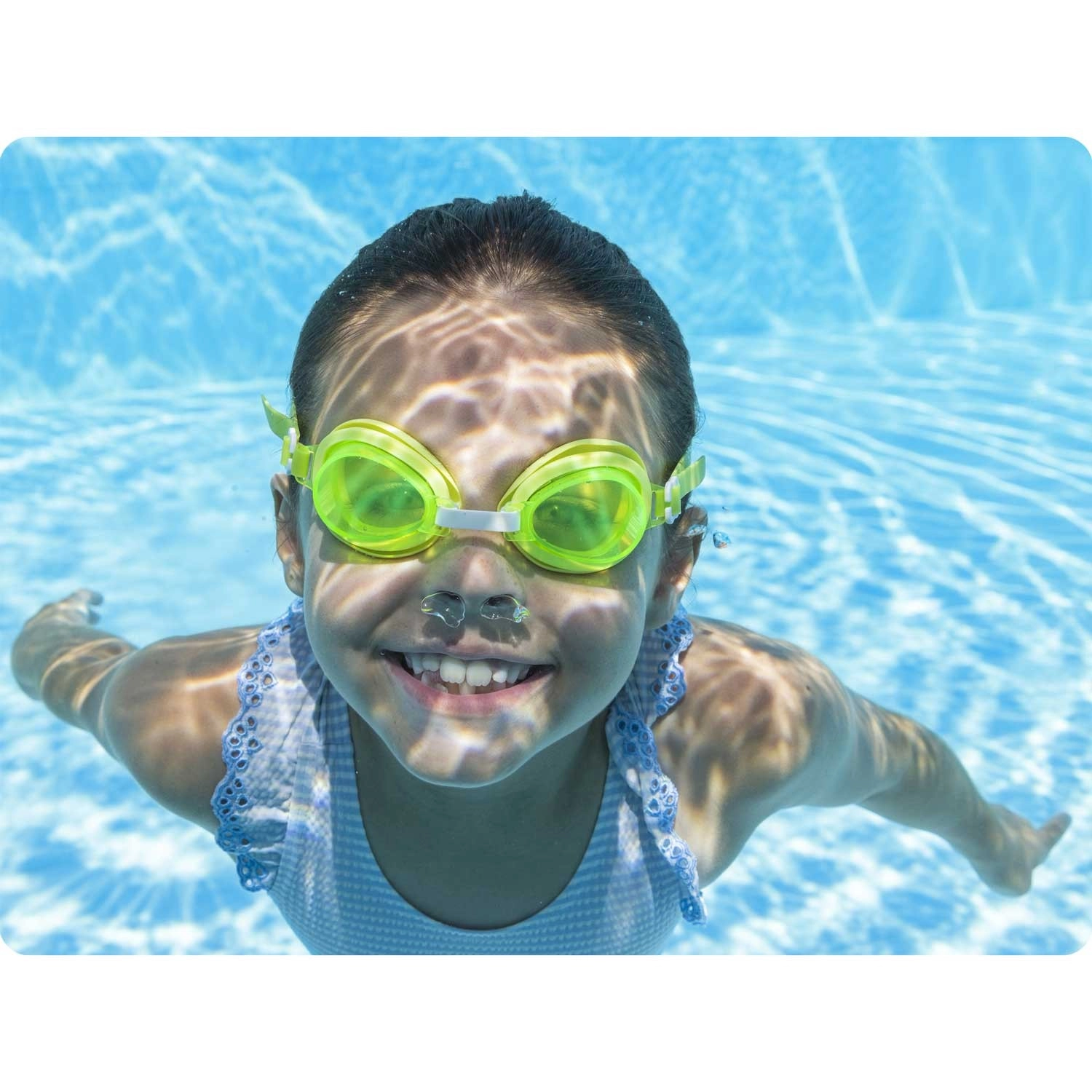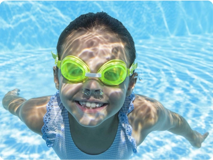 Leggeri e confortevoli, gli occhialini da nuoto per bambini Bestway in colore verde garantiscono una visione chiara sott’acqua e protezione grazie alle lenti resistenti ai raggi UV. Il morbido cinturino in silicone è completamente regolabile per un’aderenza sicura e comoda, senza materiali in lattice – ideali per bambini dai 7 anni in su.