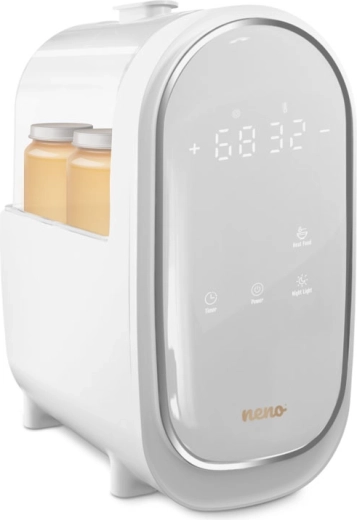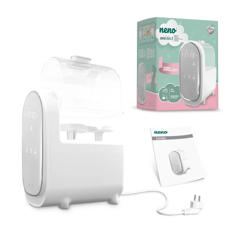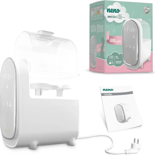 Compatto ed elegante, Neno Lindo 6in1 è un dispositivo multifunzionale per la cura dell’alimentazione e dell’igiene del bambino. Offre la sterilizzazione di biberon, succhietti e massaggiagengive, un riscaldamento preciso di latte e pasti, scongelamento e mantenimento della temperatura. Grazie al pannello touch, alla retroilluminazione LED e alle modalità intelligenti, l’uso è rapido, silenzioso e sicuro anche di notte. Le dimensioni sottili fanno risparmiare spazio sul piano di lavoro e si adatta anche a un cassetto.