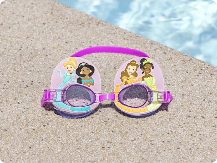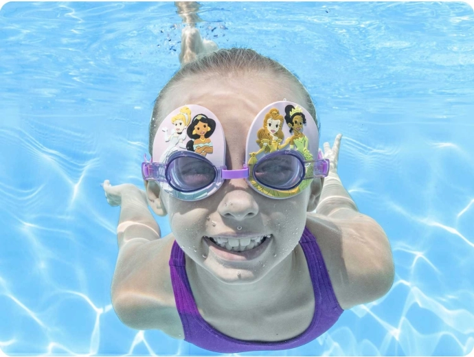 Adorabili occhialini da nuoto per bambini con motivo PRINCESS di Bestway, per un nuoto comodo e sicuro. Dispongono di lenti ipoallergeniche, protezione UV per i delicati occhi dei bambini e di un morbido cinturino in silicone con regolazione semplice per una vestibilità perfetta. Senza lattice, ideali per piccoli nuotatori dai 3 anni in su.