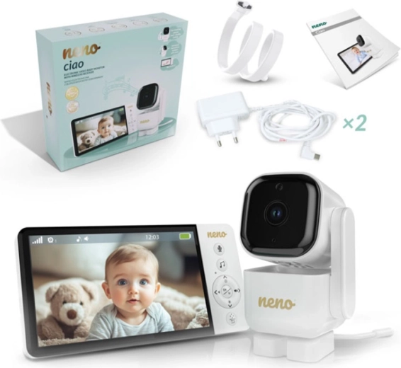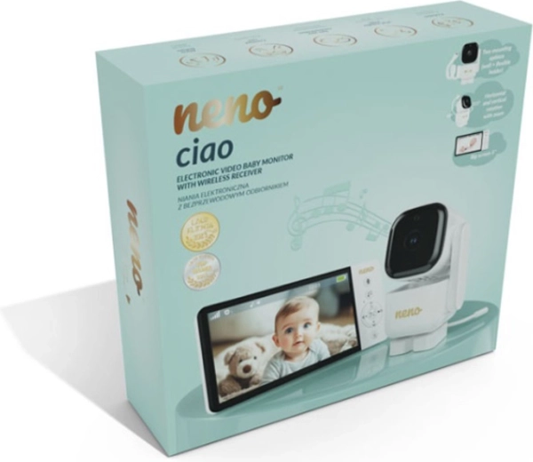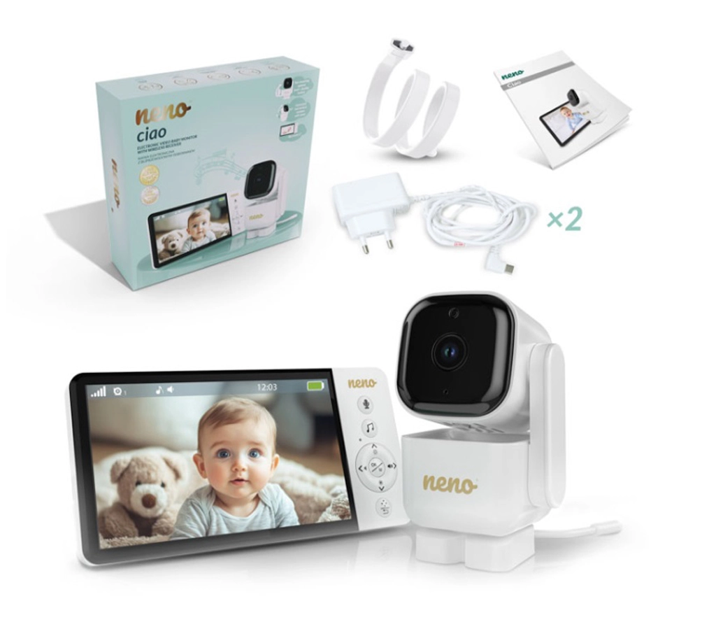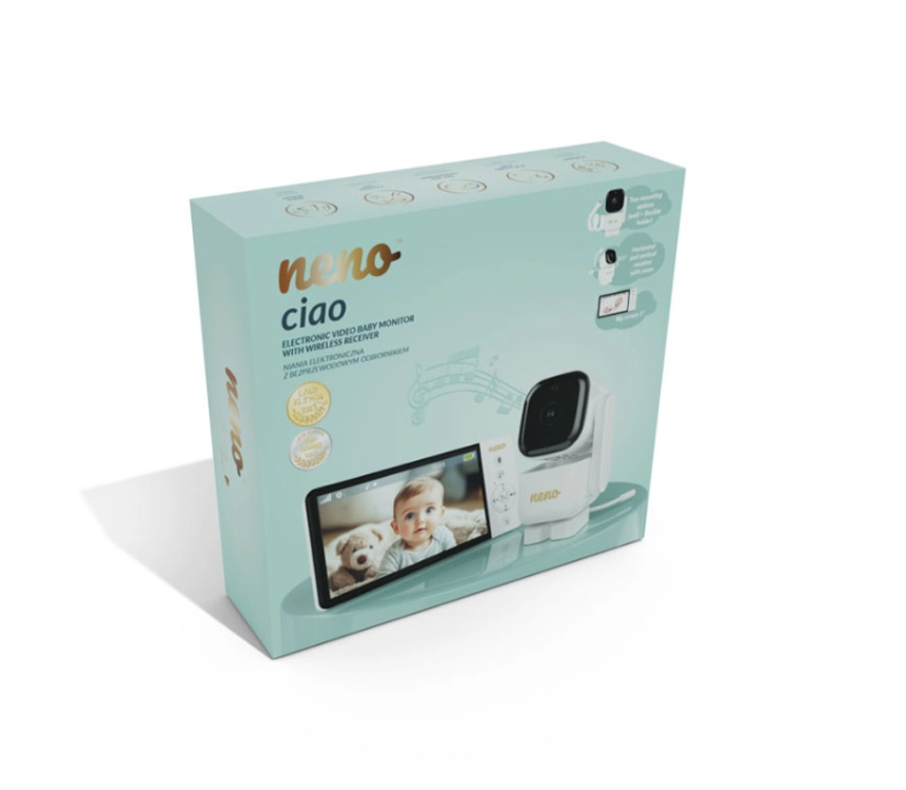 Il baby monitor video Neno Ciao vi garantisce tranquillità grazie al display a colori da 5", alla telecamera orientabile Pan & Tilt (355°/90°), alla visione notturna, alla comunicazione bidirezionale e alla tecnologia VOX per il risparmio energetico. Il trasmettitore offre un raggio d’azione fino a 300 m, sensore di temperatura, 8 ninnananne rilassanti e un’autonomia del ricevitore fino a 12 ore con batteria integrata da 5000 mAh.