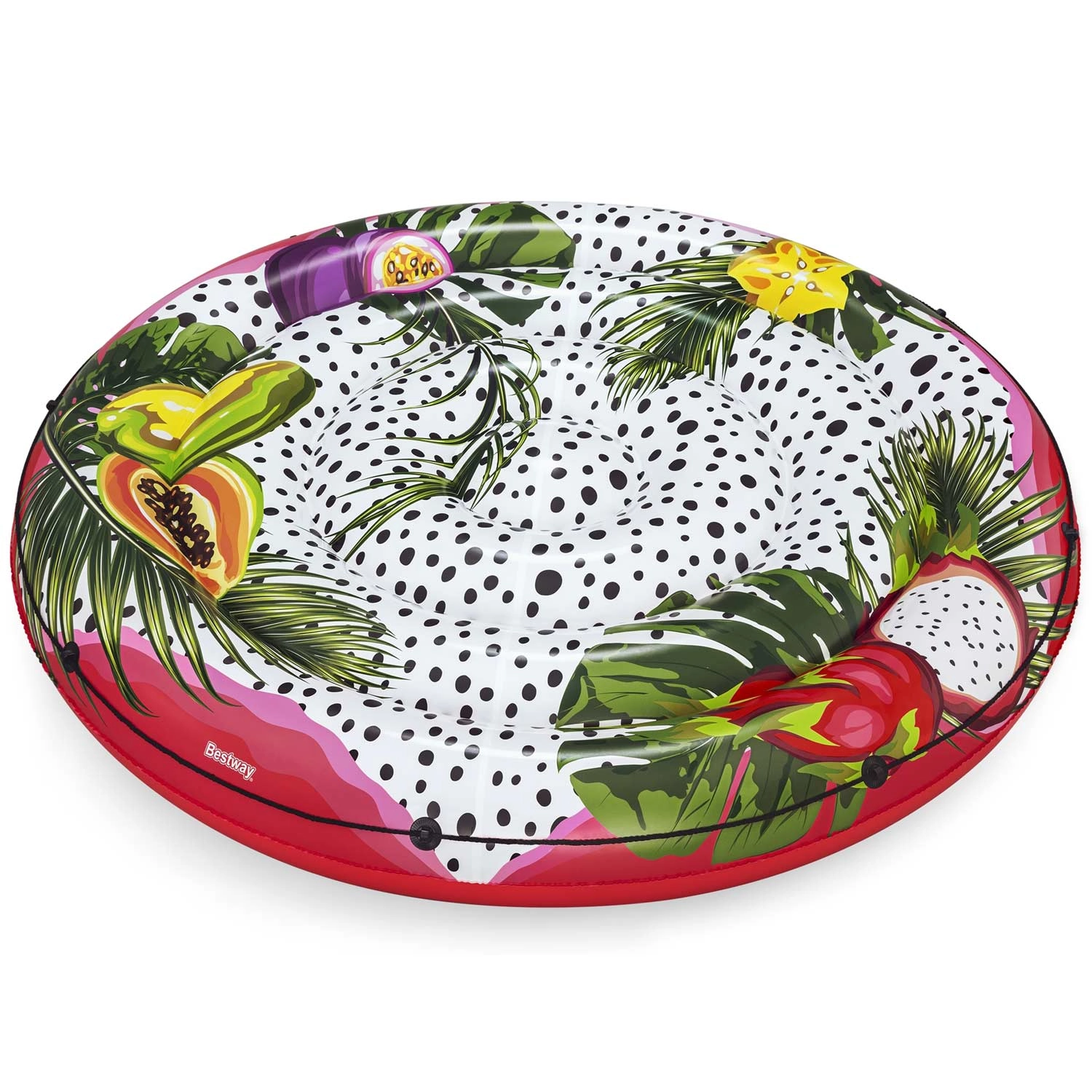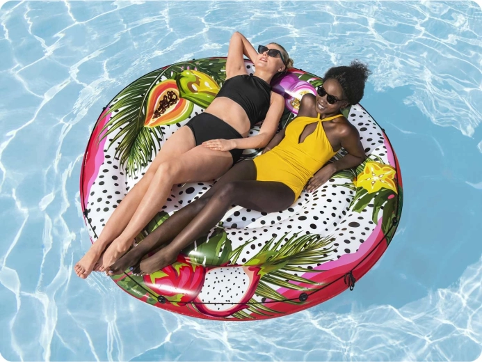 Scopri comfort e divertimento in acqua con l’isola materassino BESTWAY in formato XXL. Grazie all’ampia superficie circolare potrai rilassarti in due, sia in piscina, al lago che al mare. La stampa tropicale con frutti e foglie aggiunge stile al tuo outfit estivo e attirerà l’attenzione ovunque tu vada.