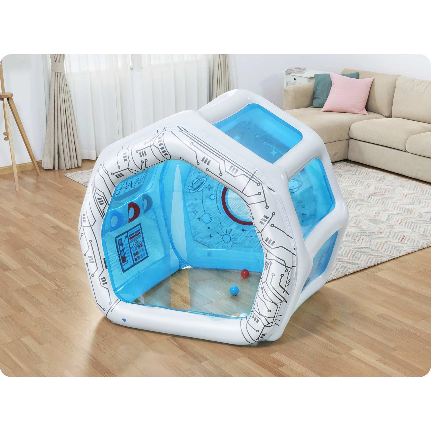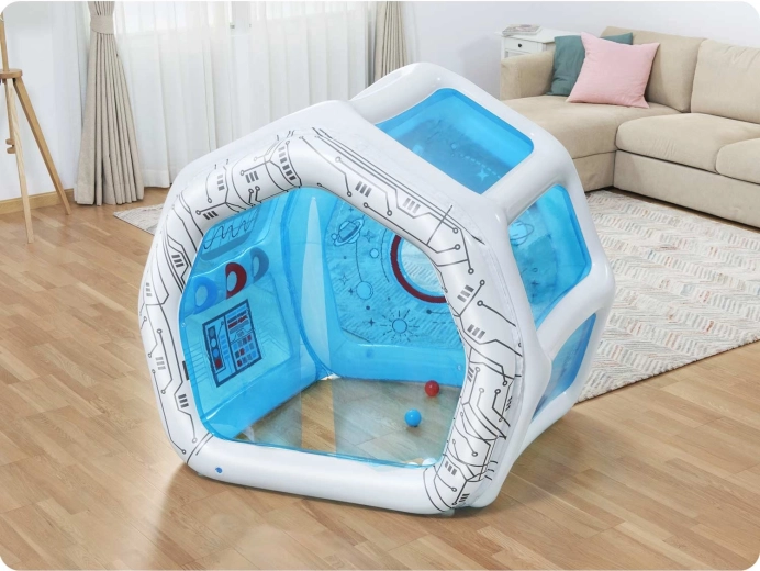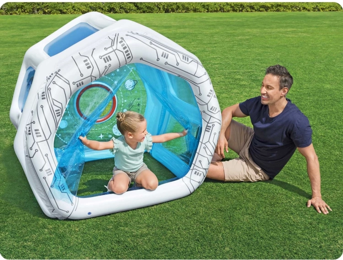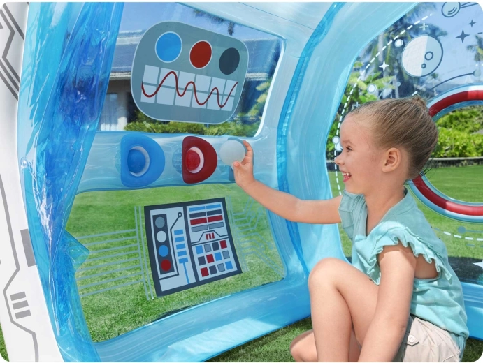 Il parco giochi gonfiabile Stazione Spazio offre ai bambini un ambiente sicuro e stimolante per giocare, nascondersi e scoprire. Grazie ai pannelli trasparenti i genitori hanno sempre un’ottima visibilità, mentre le morbide pareti gonfiabili aumentano la sicurezza durante il gioco attivo.