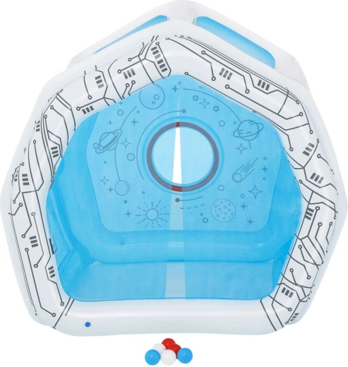 Il tema spaziale e l’elemento interattivo – smistamento delle palline sulla parete laterale – favoriscono la motricità, la coordinazione occhio–mano e lo sviluppo della fantasia. La struttura è leggera, stabile e facile da trasportare, adatta sia al giardino che agli interni.