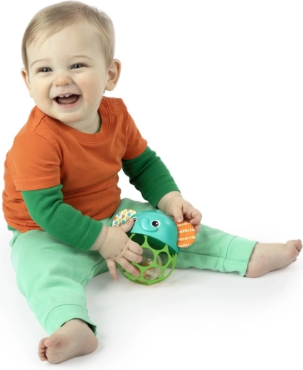 Giggle & Glow è un giocattolo leggero e resistente progettato per le manine dei più piccoli. La sfera OBALL a griglia con numerose aperture facilita la presa e lo scuotimento, mentre nella “pancina” dell'elefante una pallina con arachide produce un effetto sonoro stimolante. Le guance luminose e le risatine motivano il bambino a esplorare e sviluppano in modo giocoso i sensi.