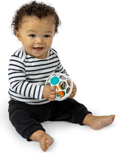 La leggera e flessibile sfera OBALL Baby Einstein Grip & Spin è progettata per essere facilmente afferrata, schiacciata e scossa dalle piccole mani. La struttura a griglia aperta favorisce una presa naturale, mentre gli elementi interni colorati ruotano durante il movimento, creando una stimolazione visiva e uditiva accattivante. Lo specchietto sicuro con il personaggio Roxy the Redbird incoraggia curiosità e consapevolezza di sé.