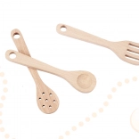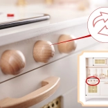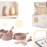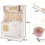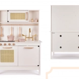 Questa cucina in legno ispirata allo stile retrò e boho colpisce per l’elegante combinazione di bianco, crema e dettagli dorati. La maggior parte degli elementi è in legno/MDF; la superficie è finemente levigata e verniciata con colori atossici per un gioco sicuro. Manopole girevoli, sportelli apribili e ganci per utensili invitano all’esplorazione e insegnano ai bambini ordine e organizzazione.