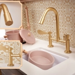 Lavello profondo con rubinetto dorato effetto metallo e doppie manopole: perfetto per i giochi di lavaggio e preparazione. Mensole e armadietti pratici tengono tutto a portata di mano.