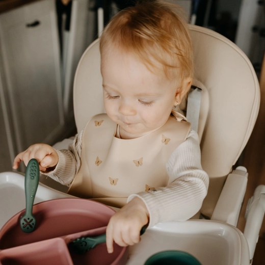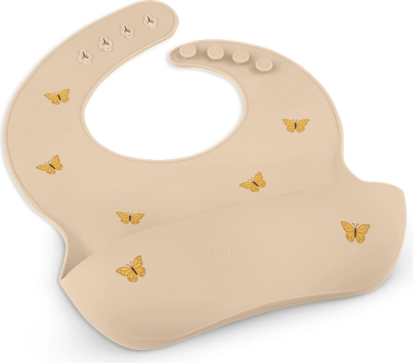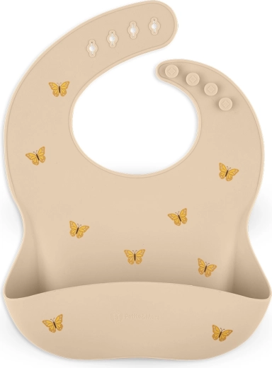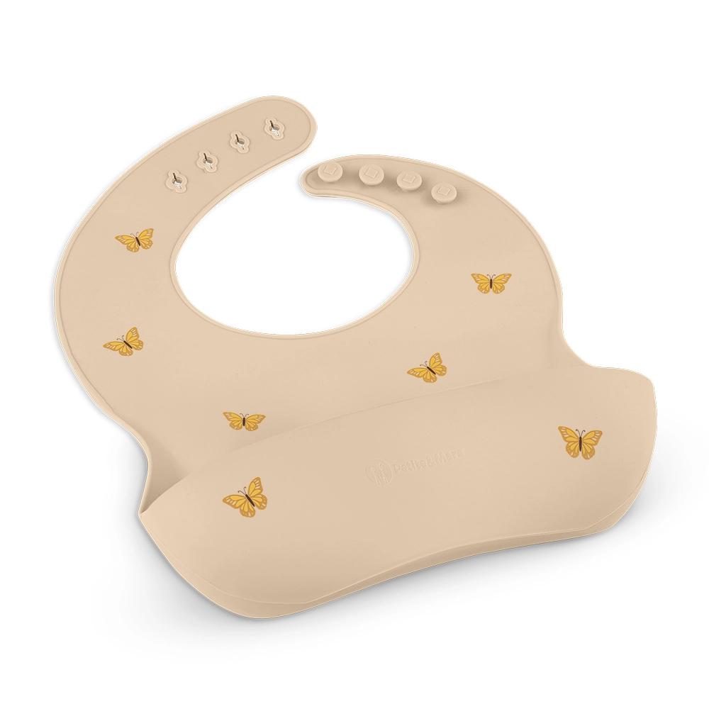Il bavaglino in silicone Petite&Mars Take&Match nella tonalità Sand con delicati motivi di farfalle è l’aiutante ideale per le prime pappe e per il pasto autonomo. La forma ergonomica e il silicone morbido si adattano piacevolmente al collo del bambino, mentre la tasca profonda cattura efficacemente il cibo che cade mantenendo i vestiti puliti.
