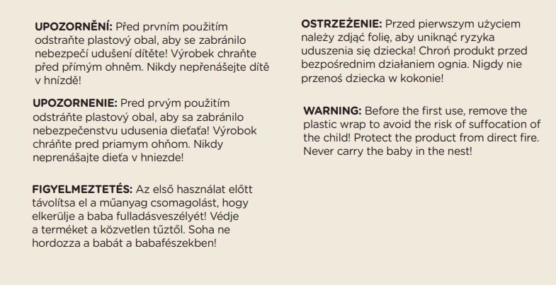 - Rimuovere l’imballaggio in plastica prima dell’uso; tenere lontano dal fuoco; non trasportare mai il bambino all’interno del nido