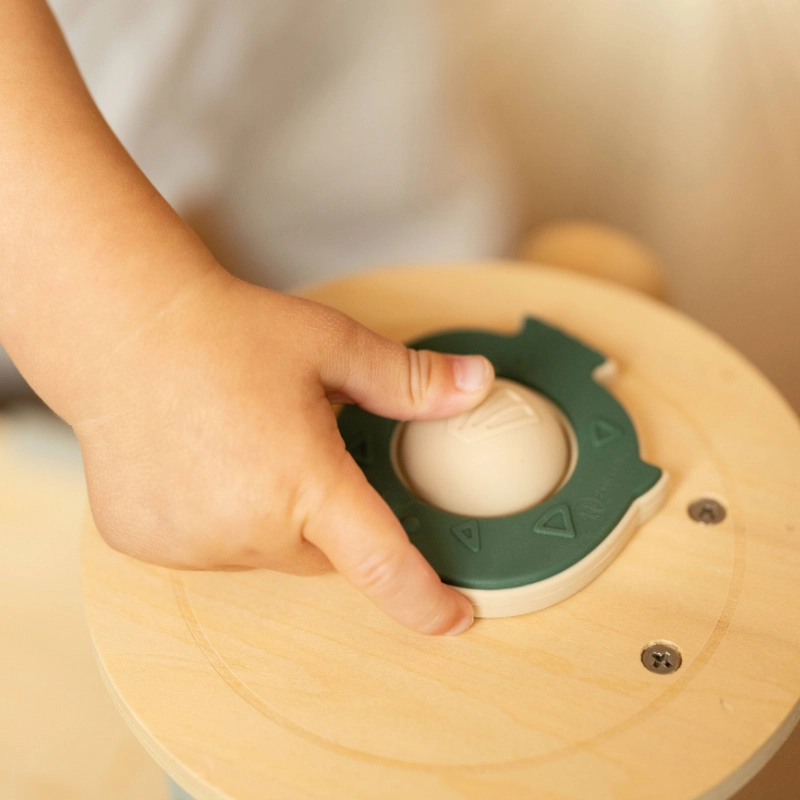 Il pulsante elastico può essere premuto e fatto scorrere da entrambi i lati, favorendo l’allenamento della presa, la coordinazione e la concentrazione attraverso il gioco.