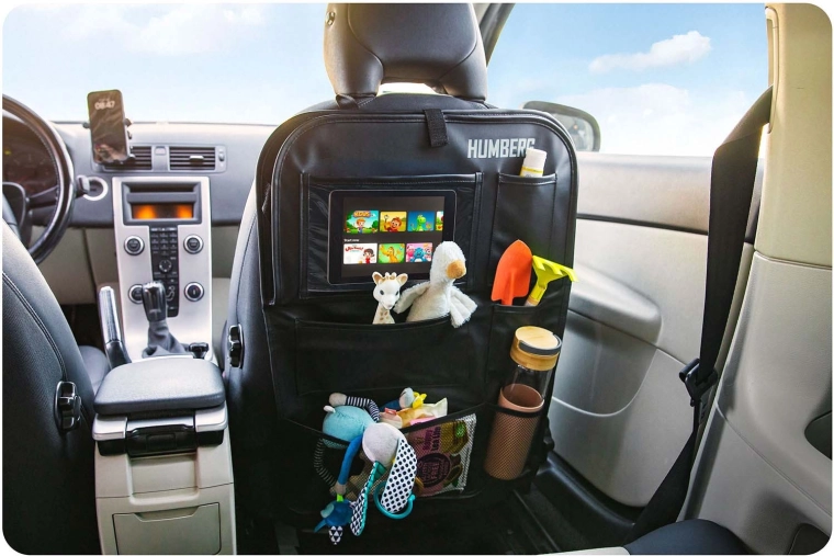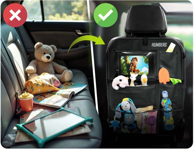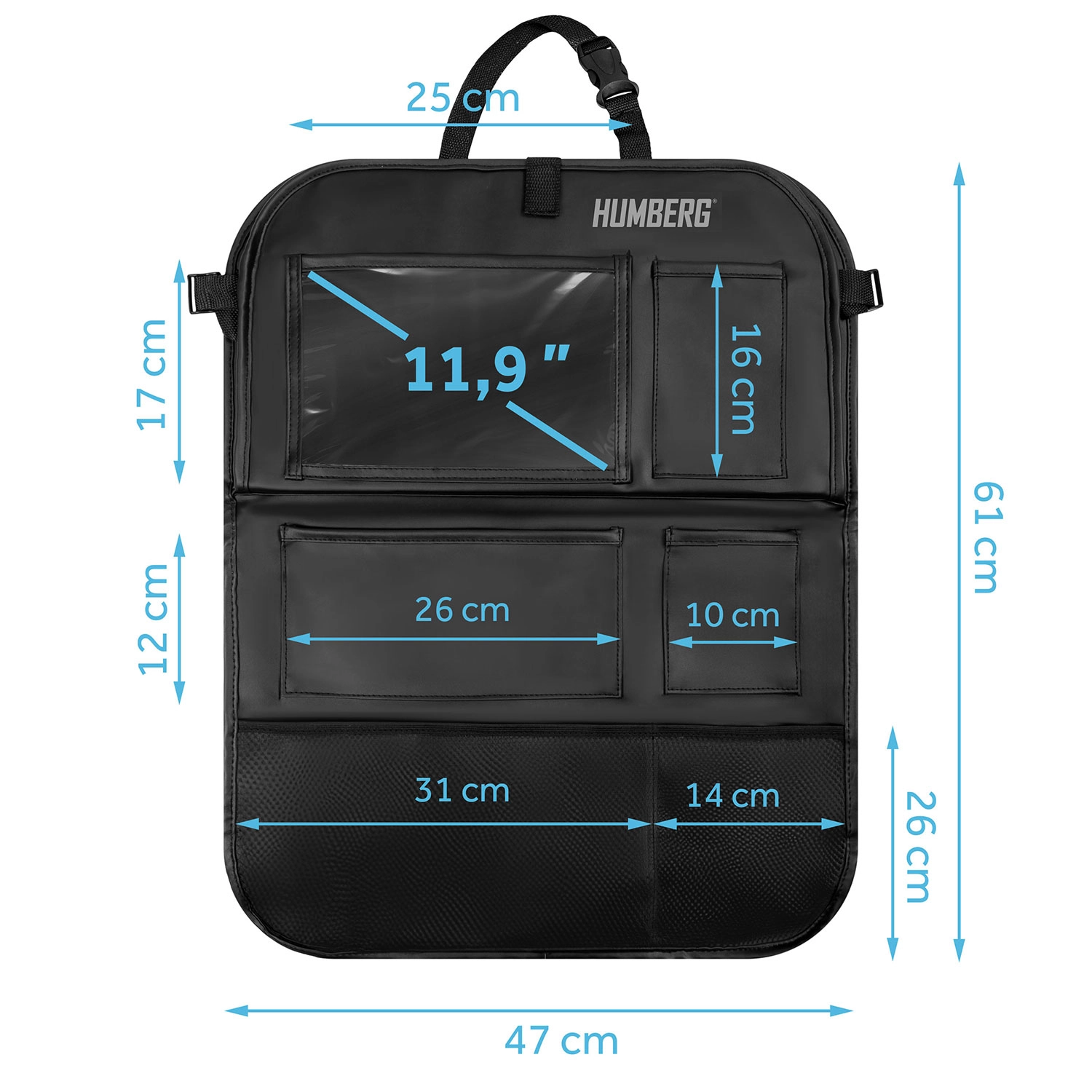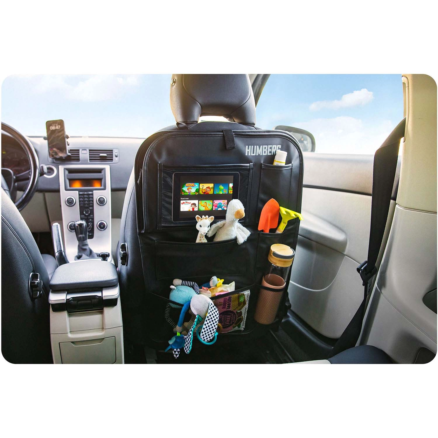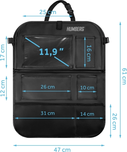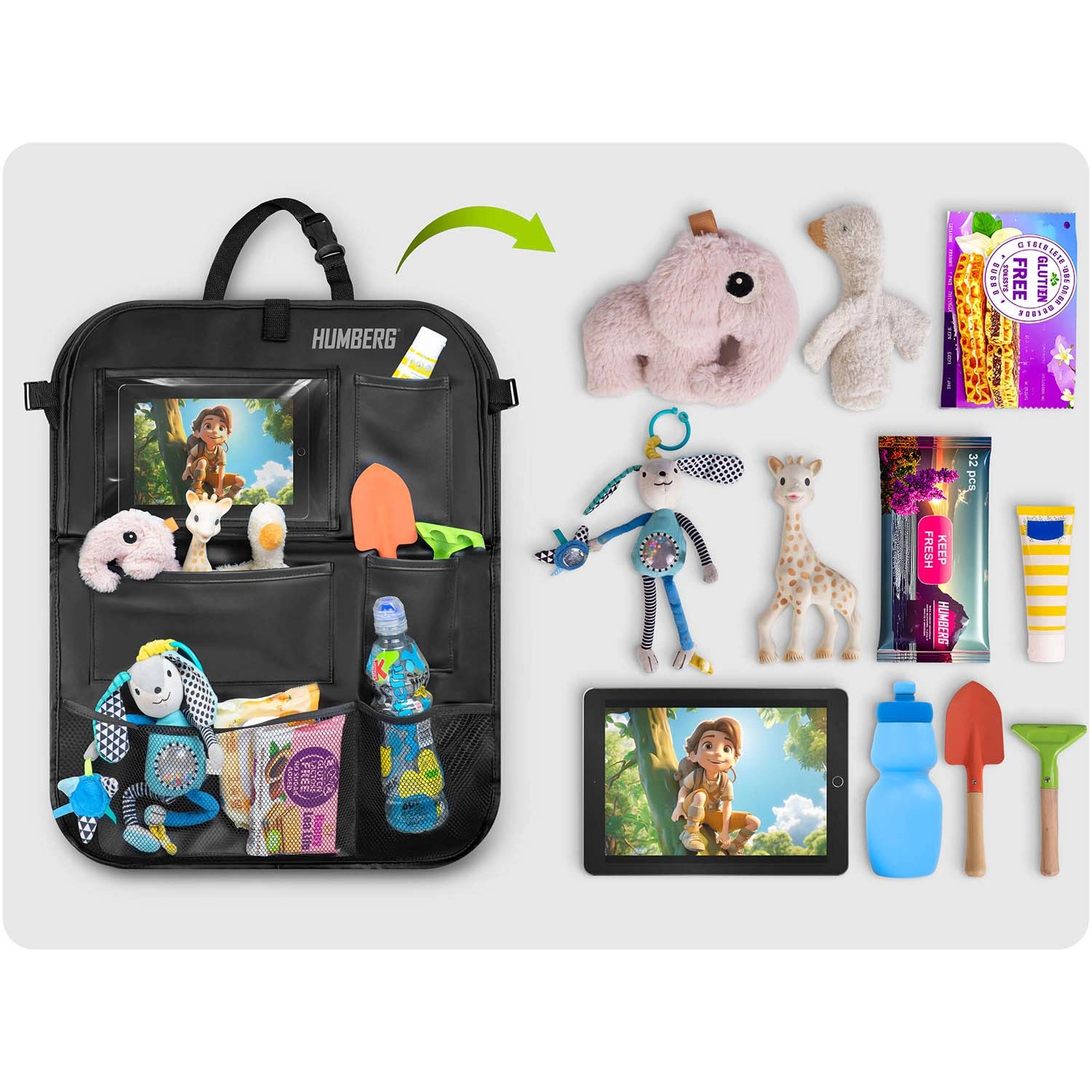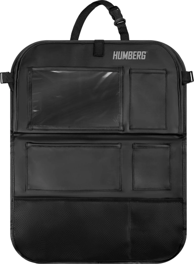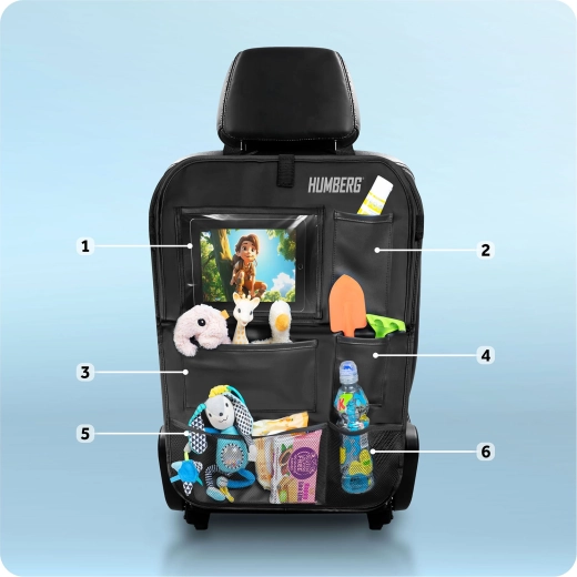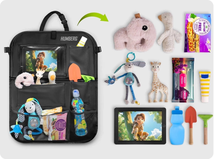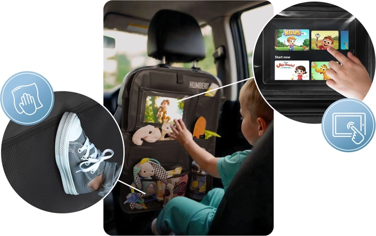 Mantieni l’auto ordinata e i viaggi con i bambini più tranquilli grazie al pratico organizer HUMBERG per il retro del sedile. Offre una tasca trasparente per tablet con pellicola touch, un ripiano richiudibile per snack o disegno, un portabottiglie e più tasche capienti per giochi e piccoli oggetti. Montaggio facile, materiale facile da pulire e protezione del rivestimento dallo sporco delle scarpe.