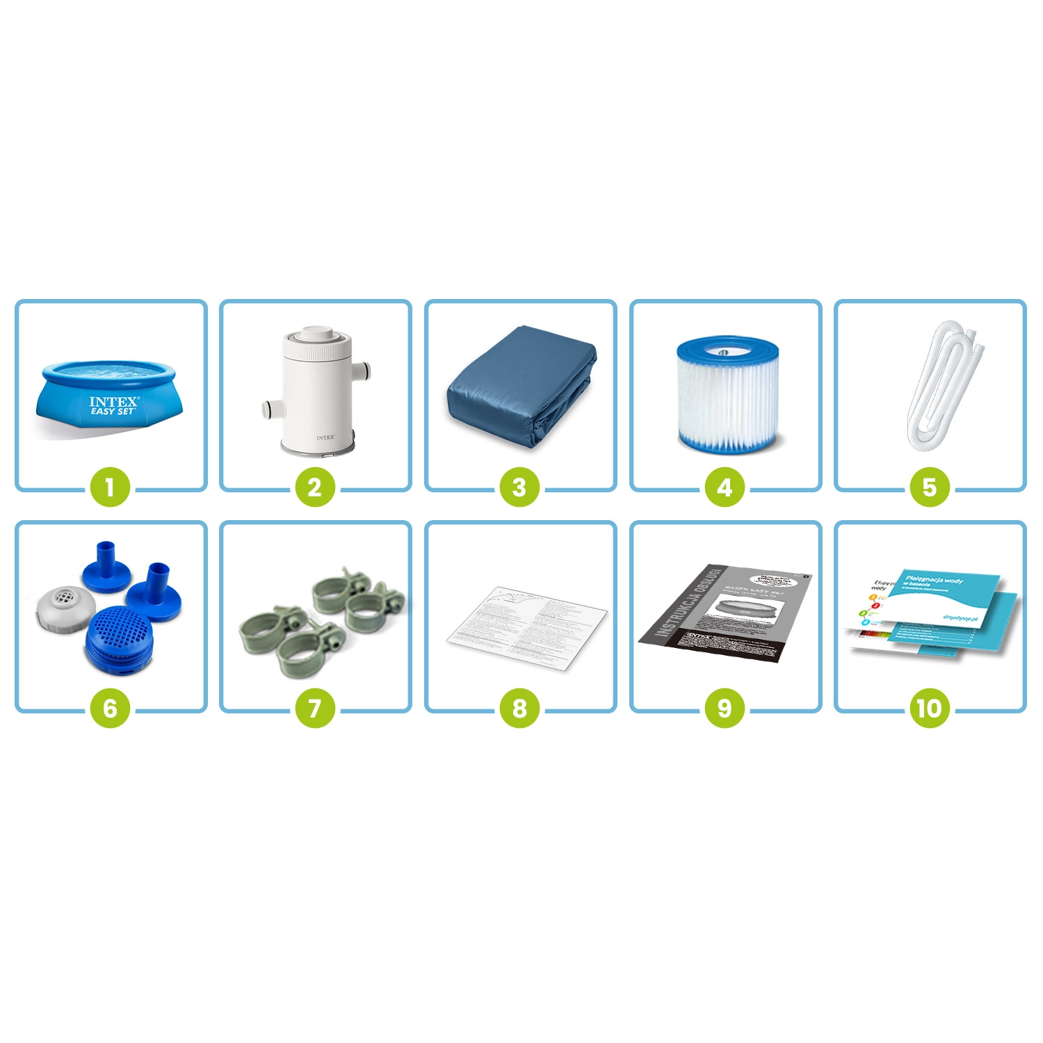 - Pompa di filtrazione, telo di copertura, filtro H, tubi, retine, clip, toppa di riparazione, manuale