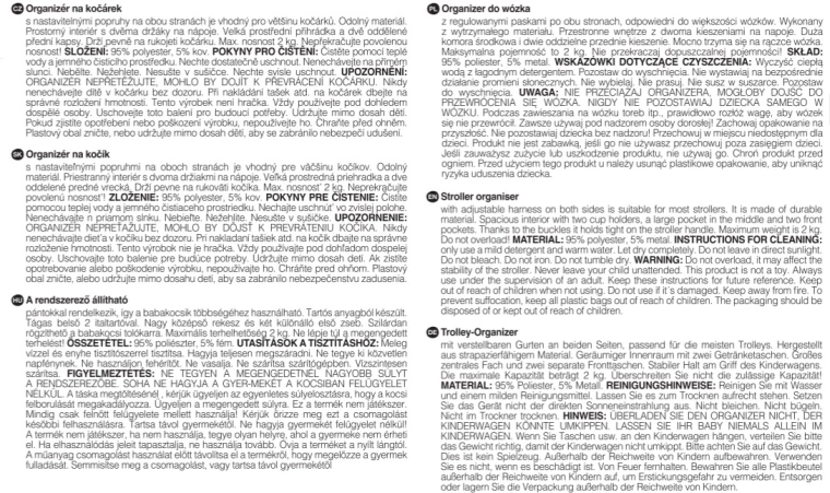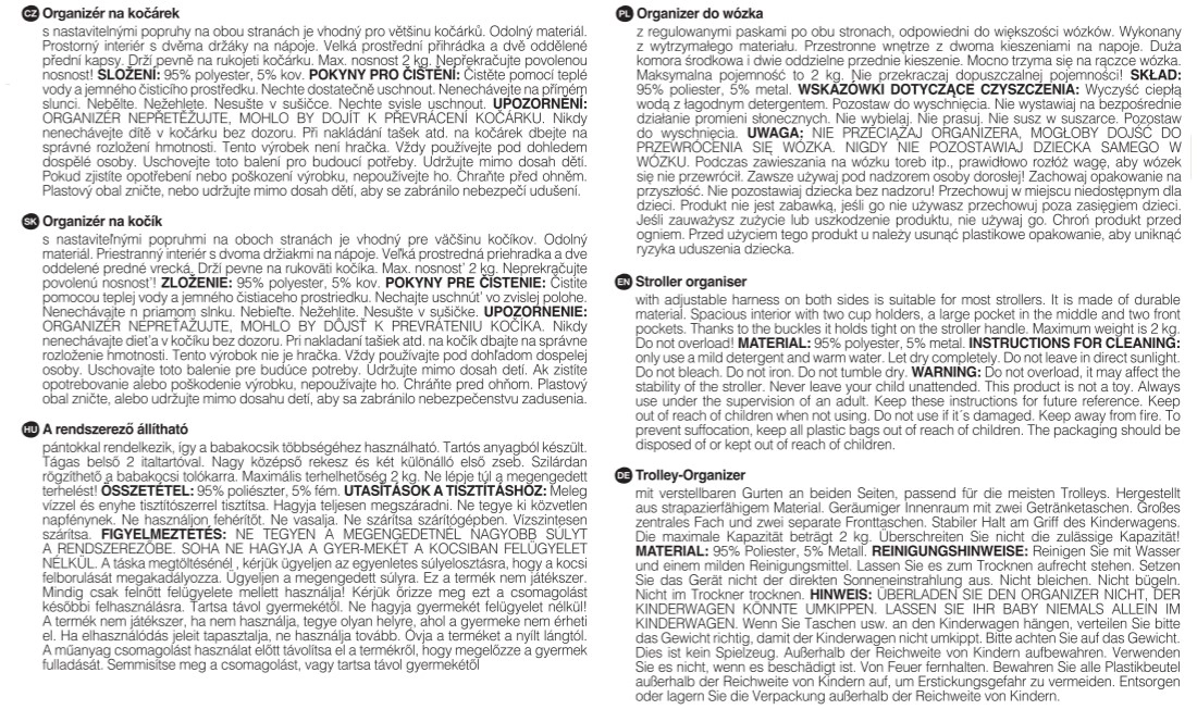 Mettete ordine in viaggio con il pratico organizer da schienale. Il materiale leggero e resistente in 100% poliestere assicura una facile manutenzione, mentre le tasche studiate con cura mantengono tutto il necessario ben ordinato – dalle bottiglie e tazze ai giocattoli o ai fazzoletti. Si installa in pochi istanti grazie alle cinghie regolabili.