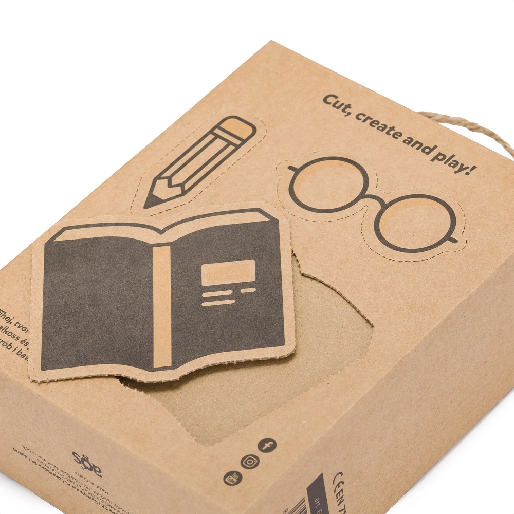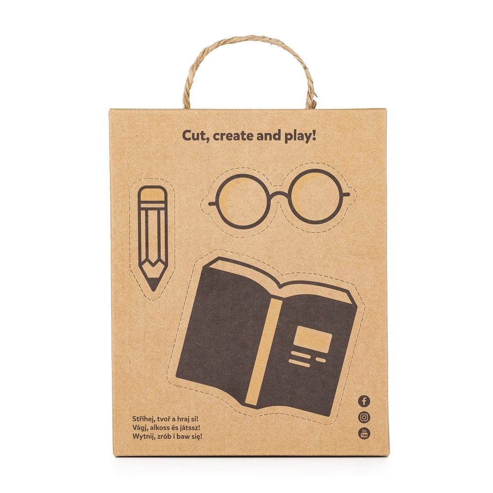 La scatola in carta kraft contiene accessori illustrati da staccare (libro, matita…), che ampliano gli scenari di gioco e stimolano la fantasia.