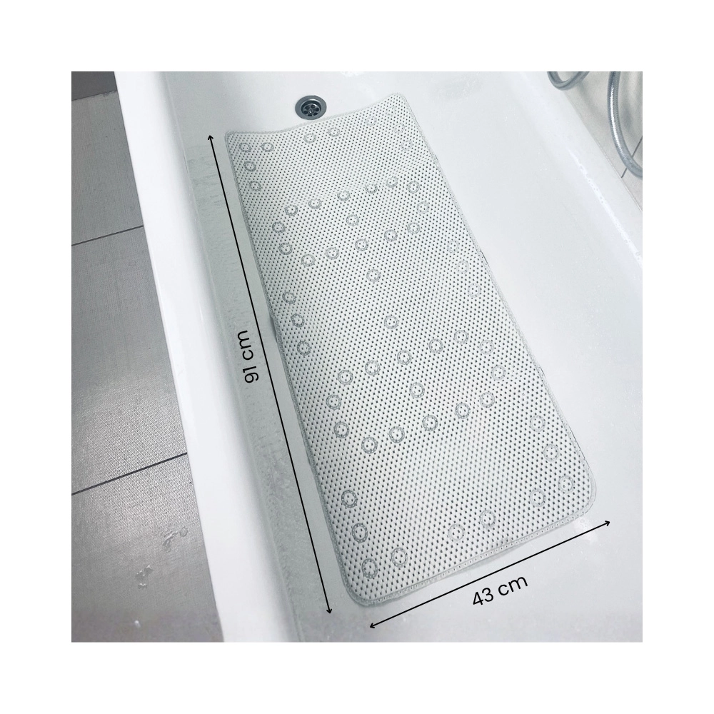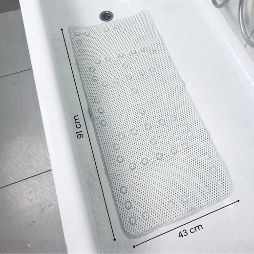 La dimensione 91 × 43 cm copre quasi tutto il fondo della vasca e offre un supporto stabile a bambini e adulti durante il bagno o la doccia.