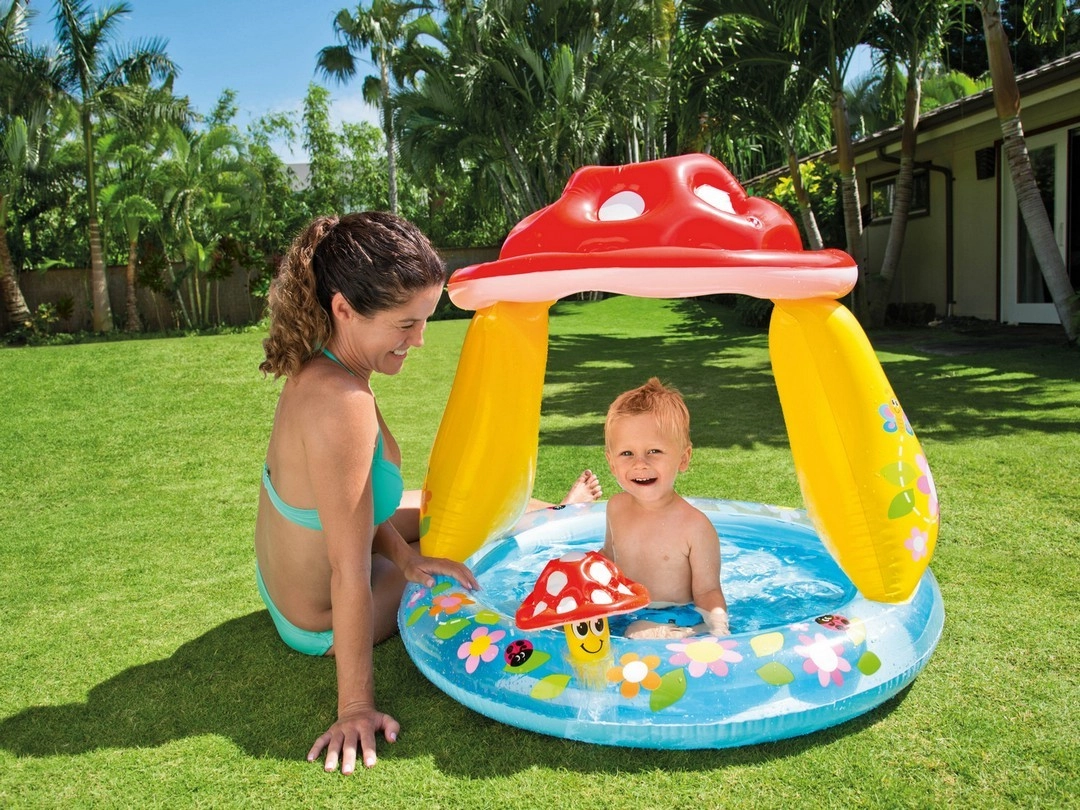 La graziosa piscinetta per bambini INTEX Amanita offre un rinfresco estivo sicuro per i più piccoli. Il tettuccio integrato a forma di amanita protegge dal sole, il fondo morbido assicura comfort e il resistente PVC resiste anche ai giochi più vivaci. Inclusi una piccola giocattolo gonfiabile e una pezza di riparazione per interventi rapidi.