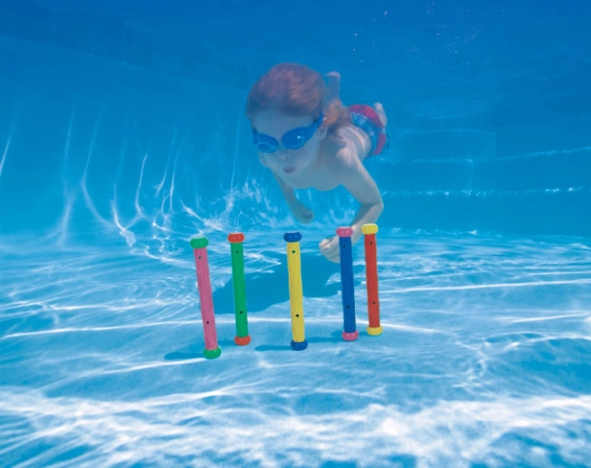 Ogni bastoncino è zavorrato, quindi dopo essere stato lanciato in acqua scende rapidamente sul fondo e rimane in verticale. I bambini possono così allenare facilmente l’immersione, l’orientamento sott’acqua e la coordinazione dei movimenti.