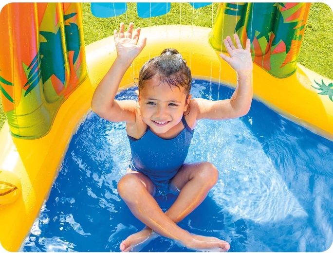 Struttura stabile in PVC resistente, facile collegamento del tubo da giardino per lo spruzzo d’acqua e pratico tappo di scarico garantiscono uso e manutenzione agevoli. Nella confezione non mancano 6 palline colorate e una toppa di riparazione per un’estate serena senza pensieri.
