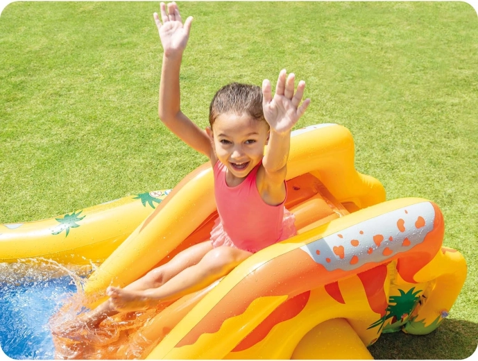 Scivolo gonfiabile sicuro con comodi bordi laterali che termina nella zona bassa degli spruzzi. Ideale per le prime scivolate in acqua in giardino.