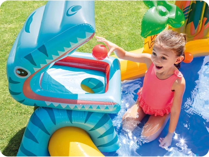 Il parco acquatico per bambini a tema dinosauri offre tante possibilità di gioco: piscina bassa per sguazzare in sicurezza, scivolo gonfiabile con arrivo morbido e doccia d’acqua dalla palma o foglia che rinfresca nella calura estiva. Il grande dinosauro gonfiabile invoglia inoltre a giocare con le palline: “nutrilo” e allena la precisione.