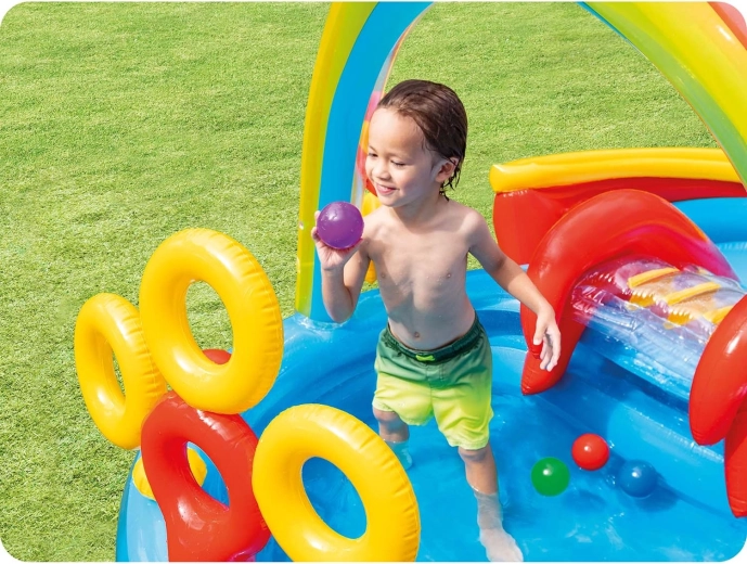Trasforma il giardino in un paradiso per bambini con il parco giochi acquatico gonfiabile Intex Arcobaleno. Offre una pozza spruzzante, uno scivolo integrato con atterraggio morbido, un arco doccia arcobaleno, un divertente gioco con anelli e una rampa per palline. Due piscinette separate, facile svuotamento e toppa di riparazione inclusa garantiscono un'estate lunga e piena di divertimento.