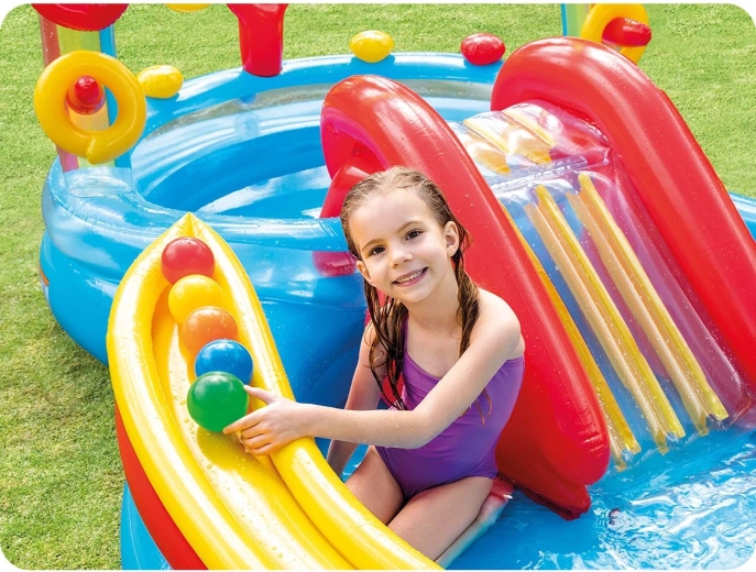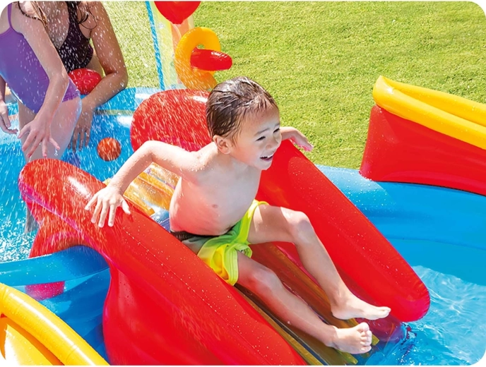 Il centro acquatico gonfiabile Intex Arcobaleno è la scelta ideale per le calde giornate estive. I bambini si divertiranno a scivolare nella piscinetta bassa, a rinfrescarsi sotto la doccia d'acqua dell'arco arcobaleno e con tanti giochi con anelli e palline colorate. Grazie alle due piscinette separate, il gioco è sicuro, ben strutturato e adattabile all'età dei bambini.