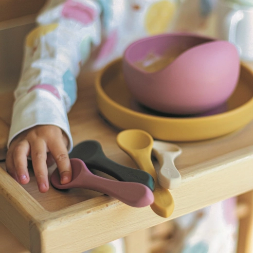 Il set di posate in silicone PETITE & MARS Take & Match nella tonalità Misty Green rende ogni pasto più semplice. I manici corti e robusti si adattano alle manine, mentre le estremità morbide sono delicate sulle gengive sensibili. Grazie al silicone alimentare senza BPA, le posate sono sicure per l’uso quotidiano, dalle prime pappe al mangiare in autonomia.