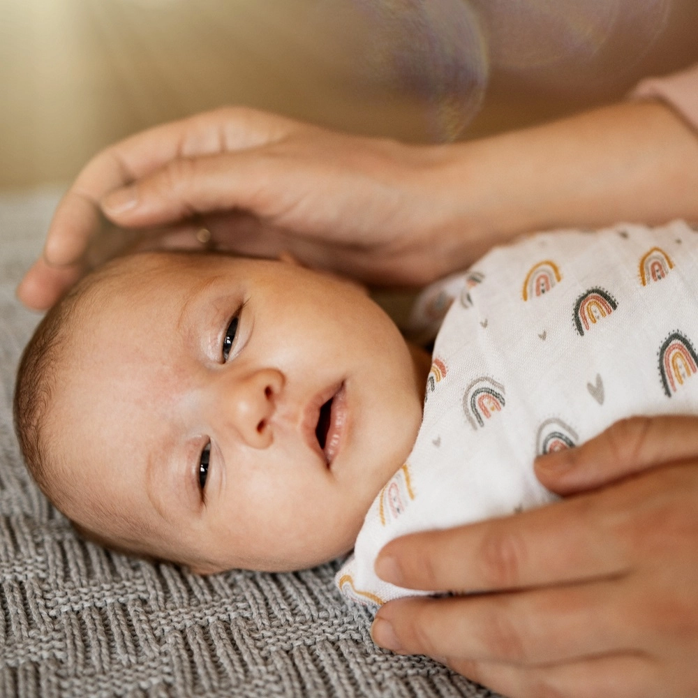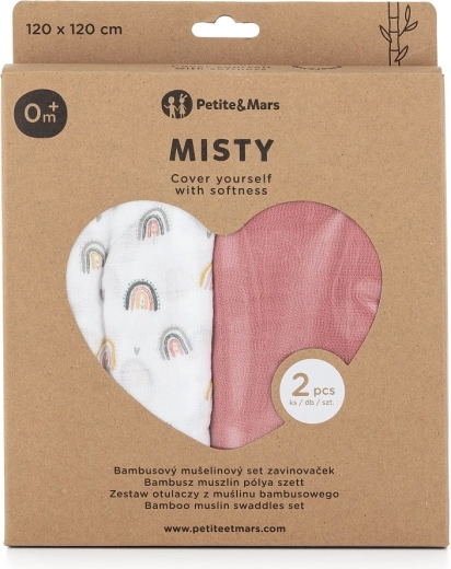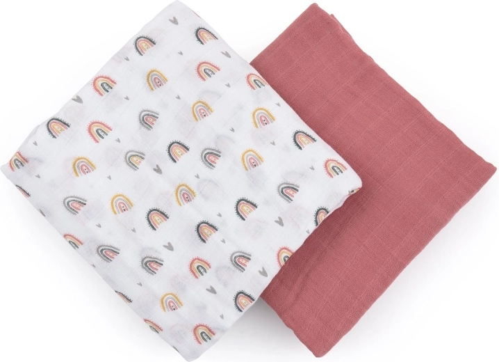 Le dimensioni generose 120 × 120 cm rendono più semplice fasciare e ampliano le possibilità d’uso in casa e in viaggio. Il set include un pezzo nel delicato tono Misty Rose e uno con un allegro motivo arcobaleno e cuoricini – un accessorio pratico e stiloso per il corredino.