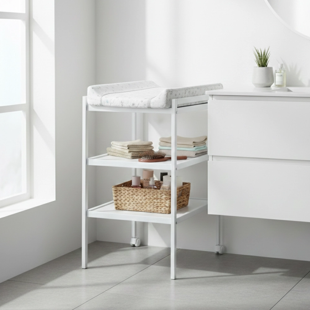 I due ripiani aperti offrono ampio spazio di stoccaggio per pannolini, cosmetici e vestitini, così da avere tutto a portata di mano. Le pratiche rotelle su due gambe consentono uno spostamento agevole del fasciatoio secondo le necessità, mentre l’altezza ergonomica contribuisce a maggiore comfort per la schiena nell’uso quotidiano.