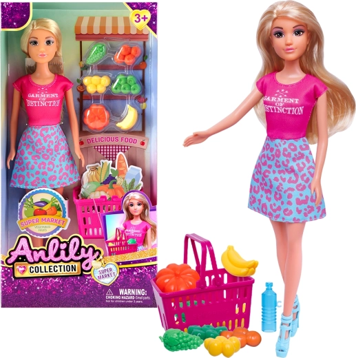 Questa graziosa bambola, con un bellissimo abito, è pronta per fare acquisti nella colorata bancarella di frutta e verdura. I bambini possono comprare, ordinare e trasportare gli alimenti nel capiente carrello, apprendendo in modo naturale i principi fondamentali di una dieta equilibrata.