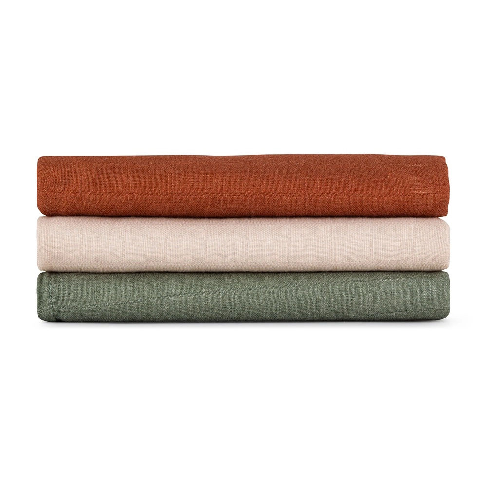 La versatilità è perfetta a casa e in viaggio: come pannetto, asciughino, copertina, fasciatura o panno per il ruttino. La mussola è ariosa, resistente agli odori e, grazie alla termoregolazione, rinfresca d’estate e scalda d’inverno. Le eleganti tonalità Earth Tones si abbinano facilmente al corredo.