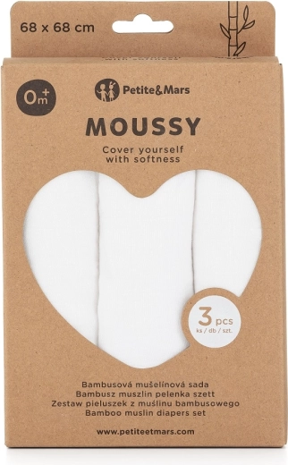Il set PETITE&MARS Moussy Total White offre tre soffici mussole composte al 70% da bambù e al 30% da cotone. Grazie all’intreccio fine e arioso sono delicate anche sulla pelle più sensibile dei neonati e assorbono molto bene. Utili in casa e in viaggio – come asciugamano, telo coccola, base d’appoggio, bavaglino o panno per il ruttino.