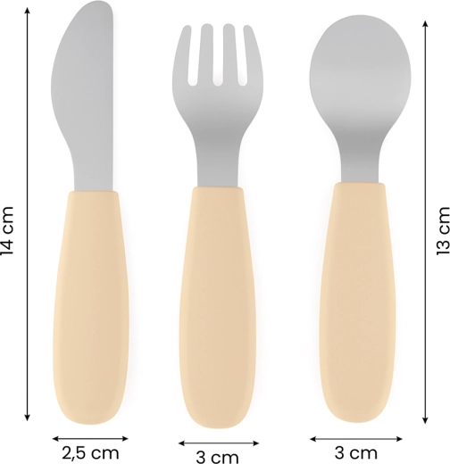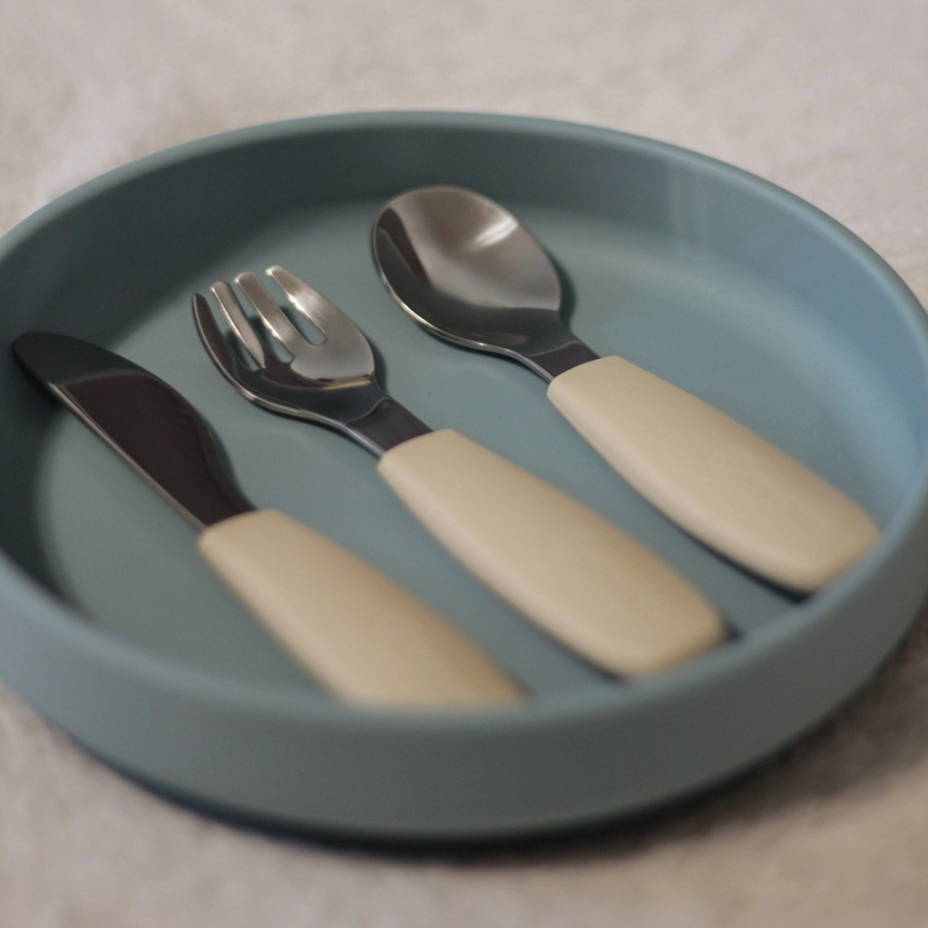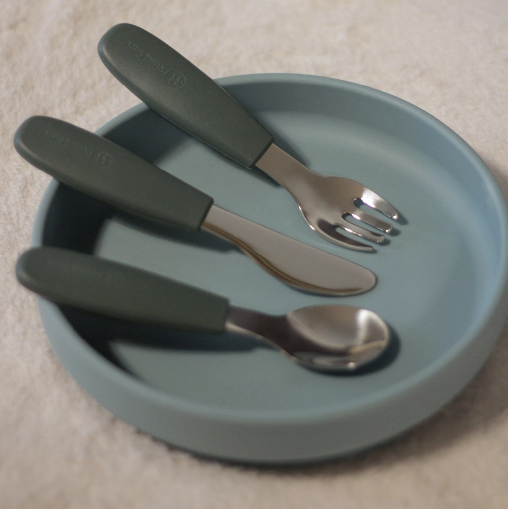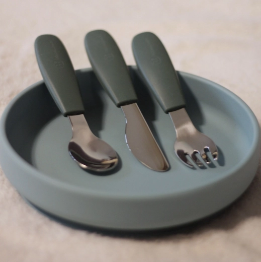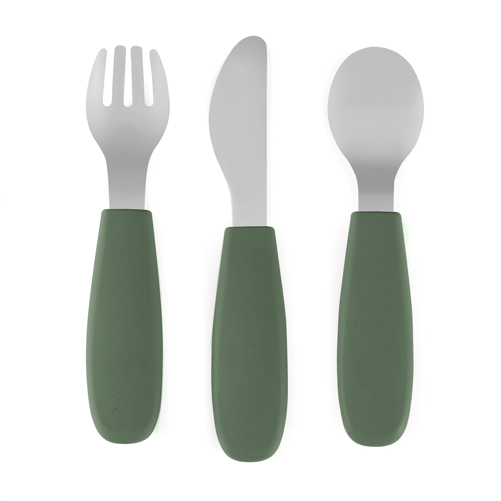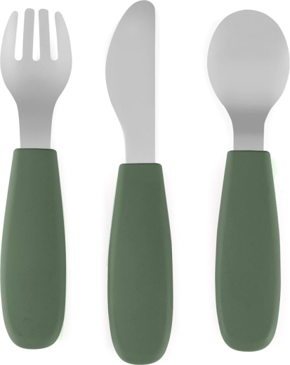 L'elegante set di posate per bambini PETITE&MARS per bimbi dai 12 mesi favorisce l'alimentazione autonoma. Include cucchiaio, forchetta e coltello di sicurezza in acciaio inox con impugnature ergonomiche in silicone. Presa antiscivolo, bordi arrotondati e facile manutenzione in lavastoviglie rendono questo set una scelta pratica per l'uso quotidiano. Si abbina perfettamente alla collezione TAKE&MATCH nel colore Misty Green.