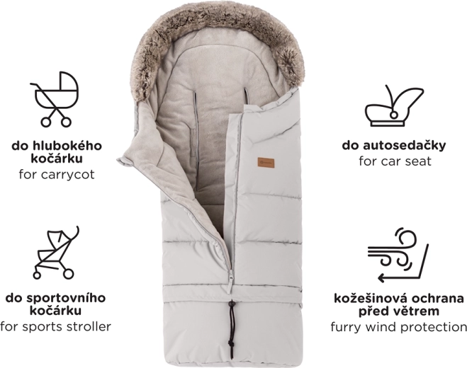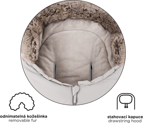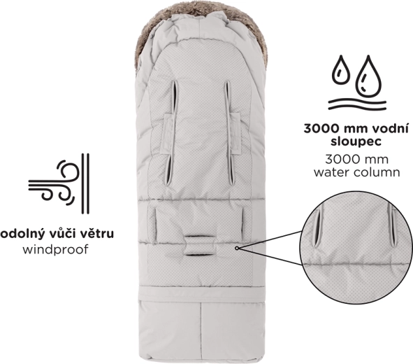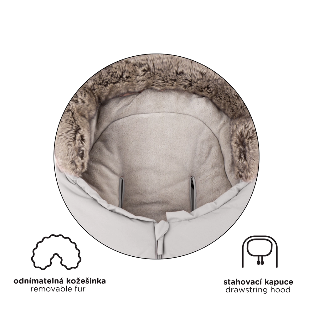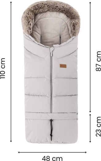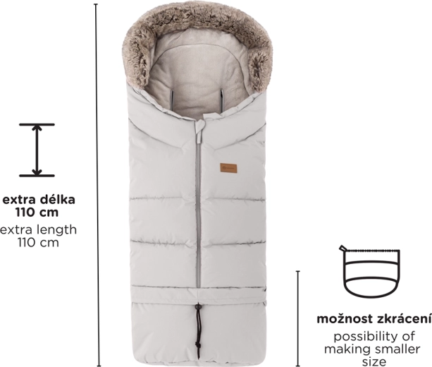 Il sacco si accorcia facilmente staccando la parte inferiore per la navicella o il seggiolino auto; nella lunghezza completa di 110 cm è ideale per il passeggino sportivo. Il bordo in pelliccia funge da protezione contro il vento.