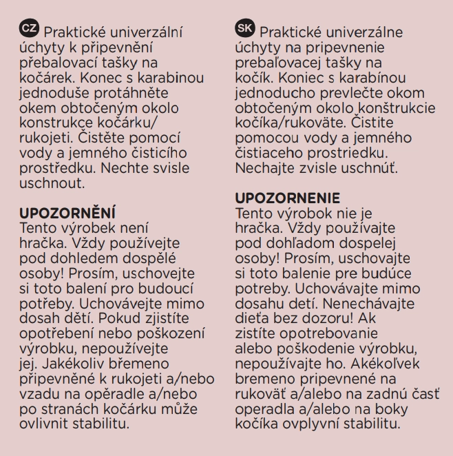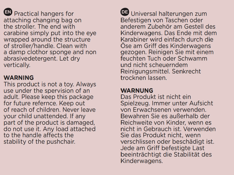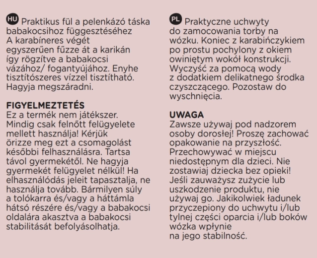 - Non sovraccaricare il manico del passeggino; il peso appeso può influire sulla stabilità. Il prodotto non è un giocattolo. Utilizzare sotto la supervisione di un adulto. Non utilizzare in caso di usura o danneggiamento.