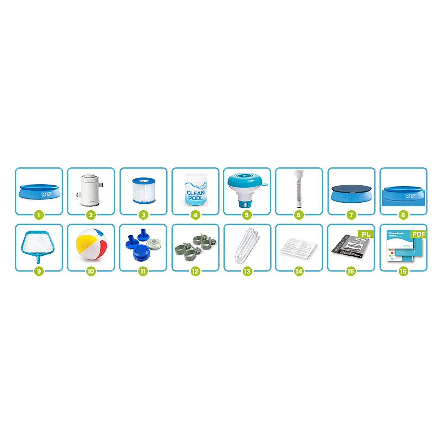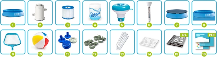 Nella confezione trovi tutto: piscina, pompa a cartuccia con filtro H, multitavolette, dosatore con termometro, copertura, tappetino, retino, tubi, clip, cestelli di aspirazione, manuale, toppa di riparazione e palla da spiaggia. Avvio semplice senza ulteriori acquisti.