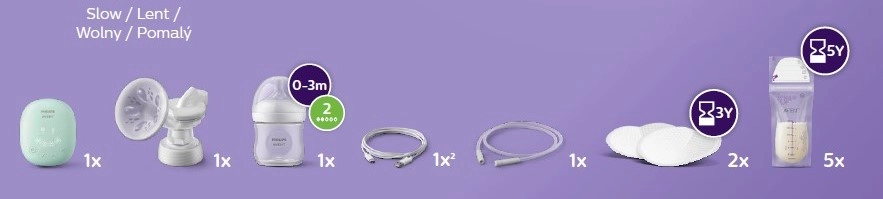 - Unità motore, tubicino in silicone, cavo USB‑C, kit di estrazione con cuscinetto, biberon Natural 125 ml, tettarella a flusso lento (1 pz), disco sigillante (1 pz), tappo a vite, sacchetti per il latte (5 pz), coppette assorbilatte (4 pz)