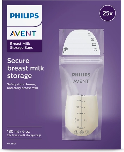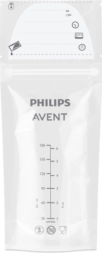 Pratici sacchetti Philips AVENT per la conservazione sicura del latte materno da 180 ml in confezione da 25 pezzi. Sono presterilizzati, hanno una chiusura a doppio zip antigoccia, cuciture rinforzate e un doppio strato di materiale per uno stoccaggio affidabile in frigorifero e congelatore. Grazie all’ampia apertura si riempiono e si versano facilmente e, grazie alla struttura robusta, stanno in piedi da soli. Il materiale è senza BPA e i sacchetti possono essere riposti in piano per risparmiare spazio.