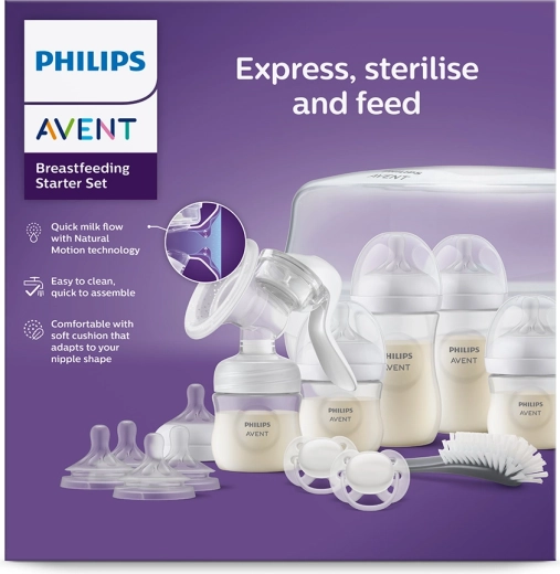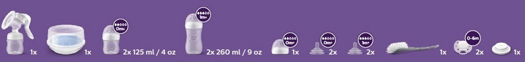 Contenuto della confezione: 1× tiralatte manuale per latte materno; 1× sterilizzatore a microonde; 2× ciuccio Ultrasoft 0–6 mesi; 2× tettarella 0 m+; 2× tettarella 1 m+; 2× biberon da 260 ml; 2× biberon da 125 ml; 1× spazzola per biberon.