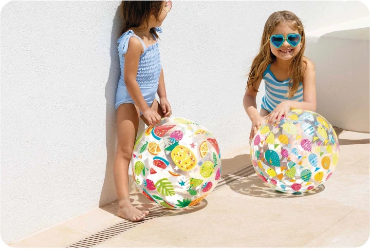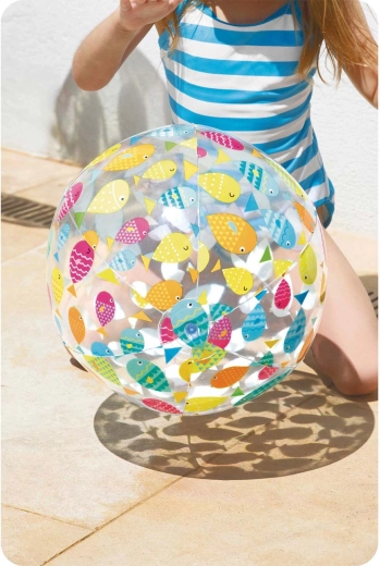La palla trasparente con pesci colorati è ben visibile in piscina e in spiaggia e invoglia al gioco sia bambini che adulti.