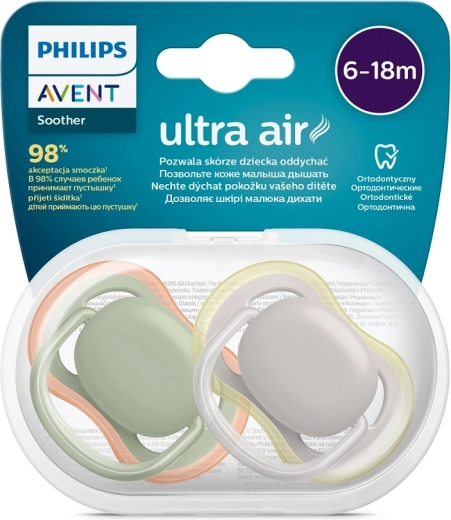 Calma il tuo bimbo con il delicato e traspirante succhietto Philips Avent Ultra Air per 6–18 mesi. Presenta fori di ventilazione extra grandi per un contatto gentile con la pelle, una tettarella ortodontica in silicone senza BPA e una pratica scatolina per sterilizzazione/trasporto adatta al microonde per un'igiene facile a casa e in viaggio.
