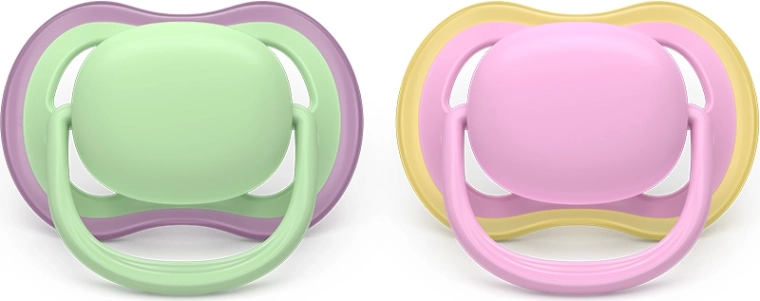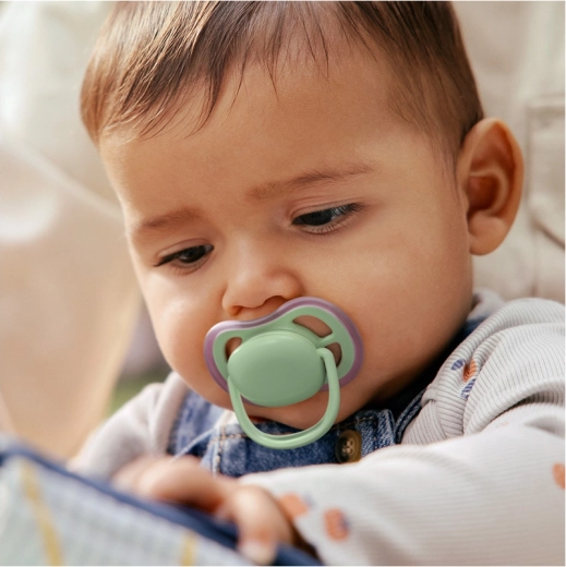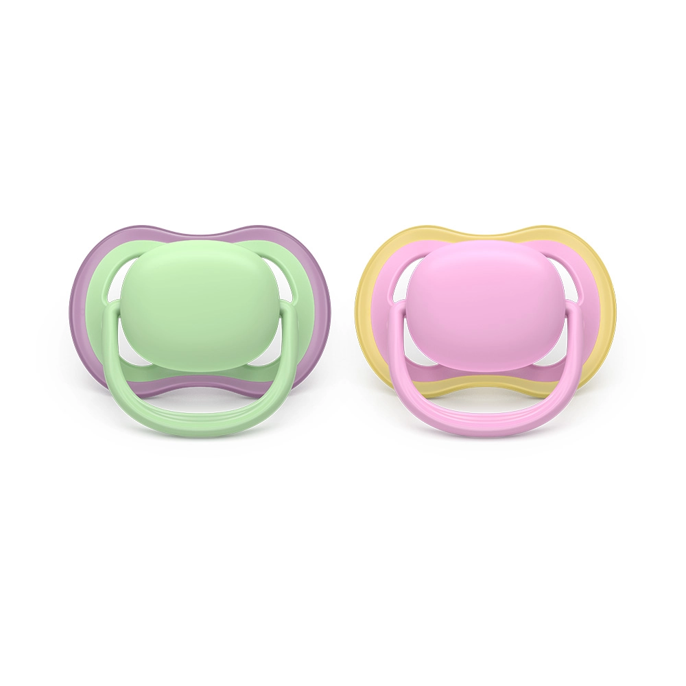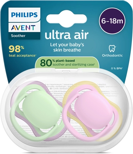 Philips Avent Ultra Air è progettato per offrire massimo comfort e uno sviluppo sano. Le grandi aperture di ventilazione mantengono la pelle del bimbo più asciutta e calma, mentre il morbido silicone ortodontico ricrea una sensazione naturale e favorisce il corretto posizionamento di lingua e morso. I succhietti sono senza BPA, BPS, ftalati e PVC e la loro forma garantisce un utilizzo comodo e sicuro.