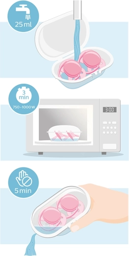 La pratica custodia funge anche da sterilizzatore: basta aggiungere acqua e riscaldare 3 minuti nel microonde.