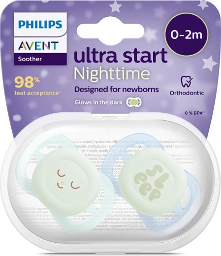 Il succhietto notturno Philips Avent è progettato per i più piccoli da 0 a 2 mesi. Ultraleggero ed ergonomico, per adattarsi a bocchine piccole senza pressione superflua. La parte frontale luminosa garantisce che il succhietto sia facile da trovare anche al buio completo, rendendo il comfort notturno rapido e senza stress.