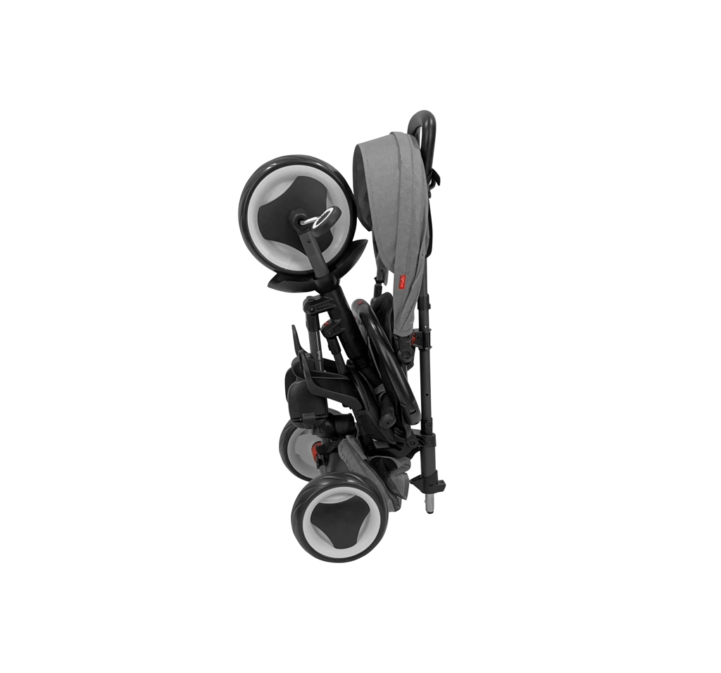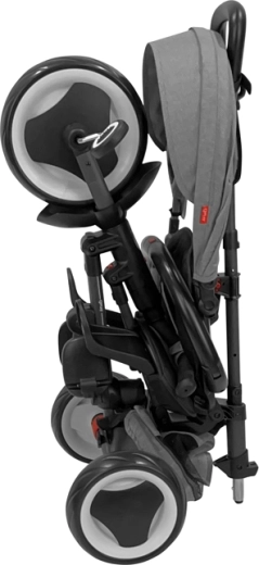 La sicurezza è assicurata da cinture a 5 punti, barra di protezione rimovibile e freni sulle ruote posteriori. Le ruote EVA antivibrazione assorbono le irregolarità e non richiedono manutenzione. Compattezza e maneggevolezza sono un plus: il triciclo si piega senza attrezzi in 3 click e, grazie al design intelligente, una volta chiuso si può trascinare come una valigia da viaggio.