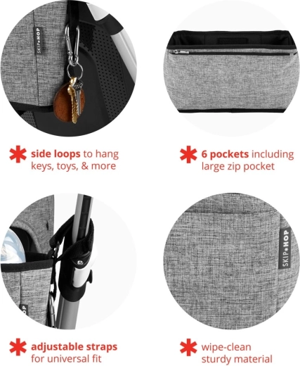 Il pratico organizer per passeggino Skip Hop Grab & Go Ultra, nella raffinata finitura grigio melange, offre sei tasche, un'ampia tasca con zip e anelli laterali per chiavi o giochini. Grazie alle cinghie regolabili si fissa facilmente alla maggior parte dei passeggini e il materiale resistente e facile da pulire mantiene tutto al sicuro e a portata di mano.